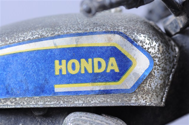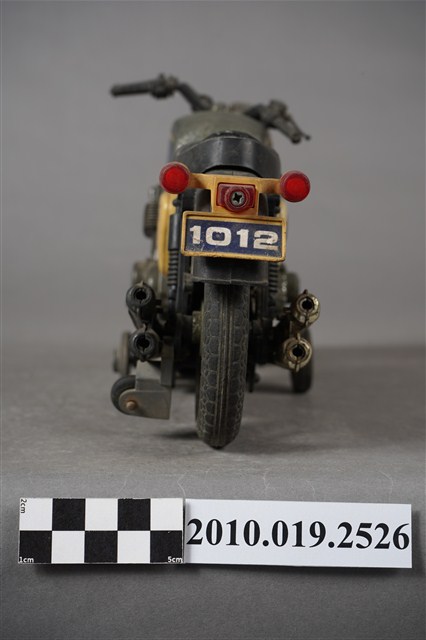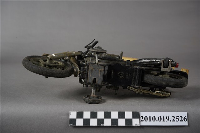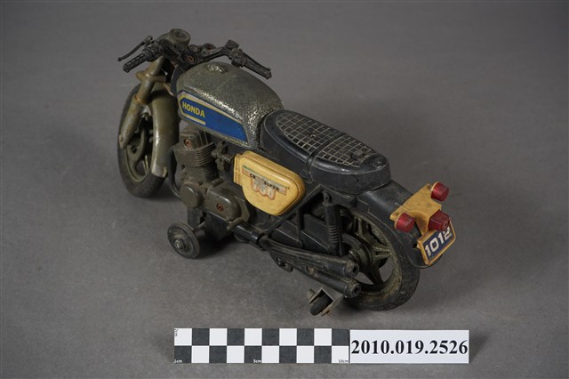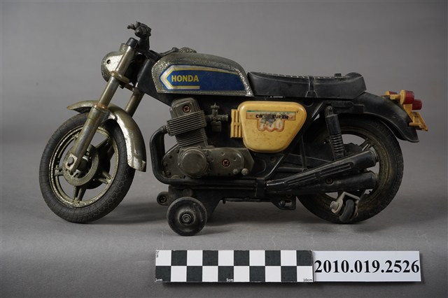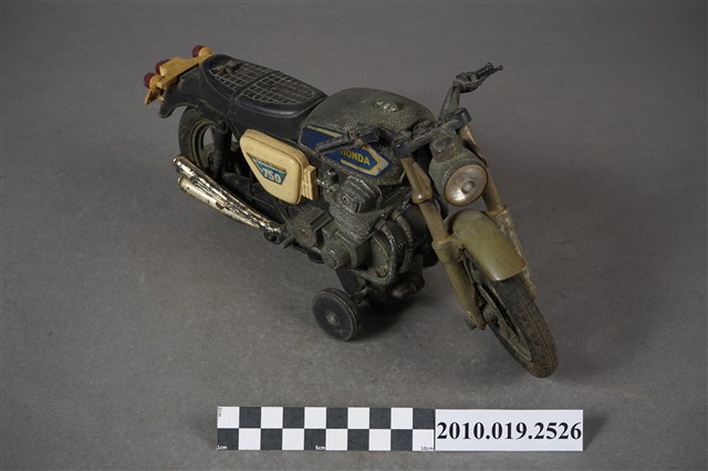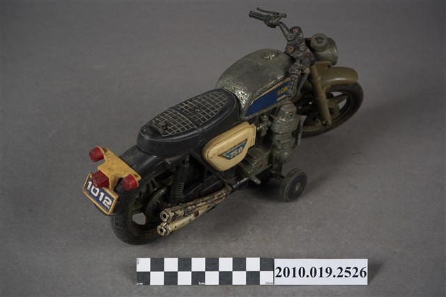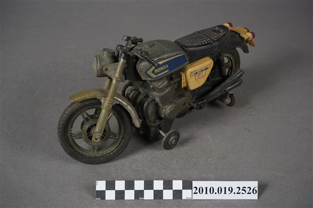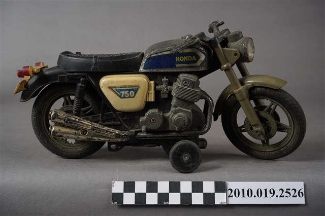 1.本物件為金屬玩具摩托車,其樣式為擋車,車身整體為黑色,其中一部分為寶藍色底白色「HONDA」、「750」。鐵製部分多半生鏽斑駁,底部有「MADE IN TAIWAN」字樣。