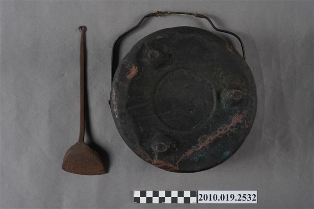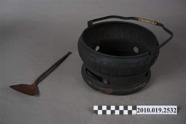 1.本件文物分為火爐及火鏟兩部分,火爐為圓形爐身,鑄鐵製,口大底小,爐壁中腰近底部向內摺收有如兩層台,爐壁鏤有數通風孔,可調節火侯。火鏟,鐵製,形如鍋鏟,鏟柄較長,用途為添加木炭及清除爐底炭灰。2.早期理髮師挑著擔子走街串巷為人們理髮,擔子一頭放凳子及理髮用具,另一頭則放小火爐及臉盆用來燒熱水。理髮時會以熱水潤濕頭髮,理髮後,再用熱水做簡單的梳洗。