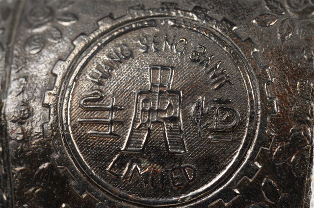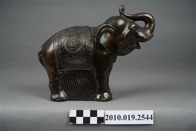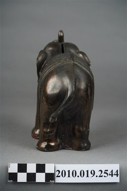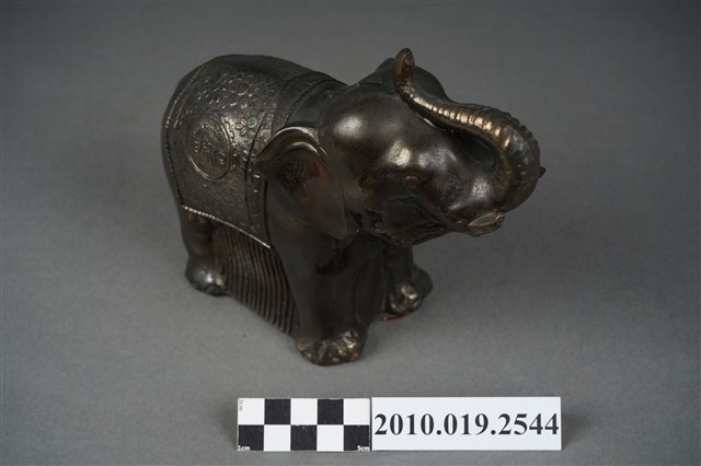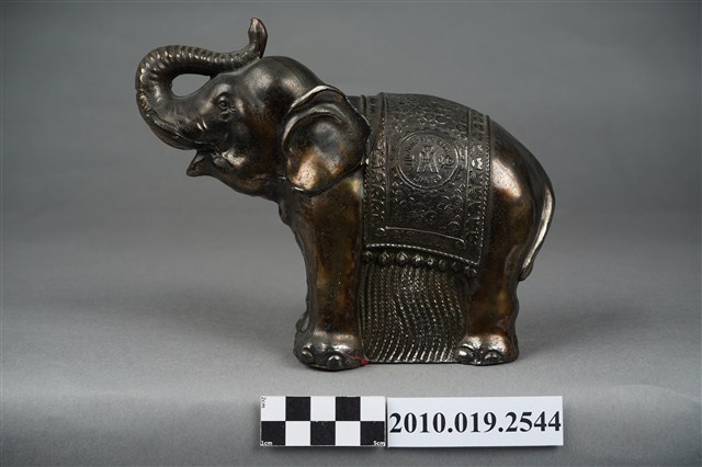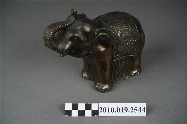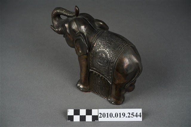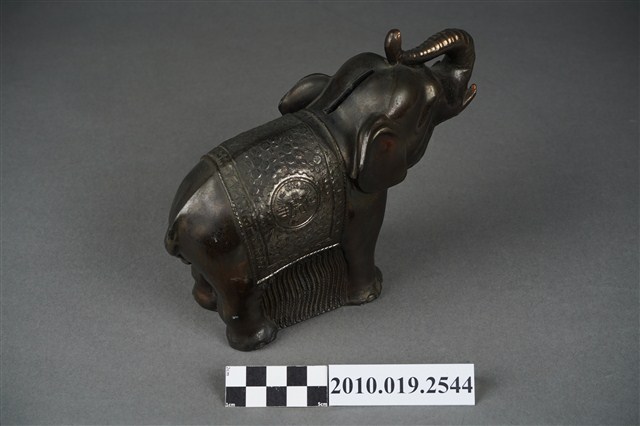 1.本物件為恆生銀行象造型存錢筒,整體為大象揚鼻的造型,象鞍上有精緻花紋,左右兩側為恆生銀行徽章。象頭有一投幣孔,底部為有設計將錢幣取出之口,寫有「恆生銀行」、「LACK TO OPEN」的字樣。