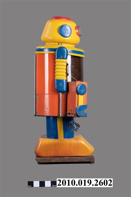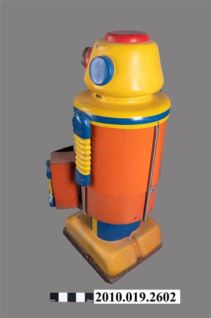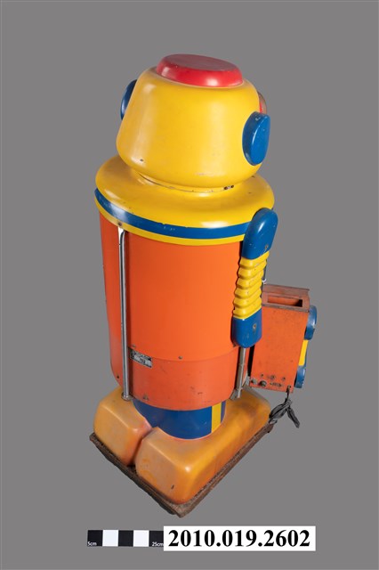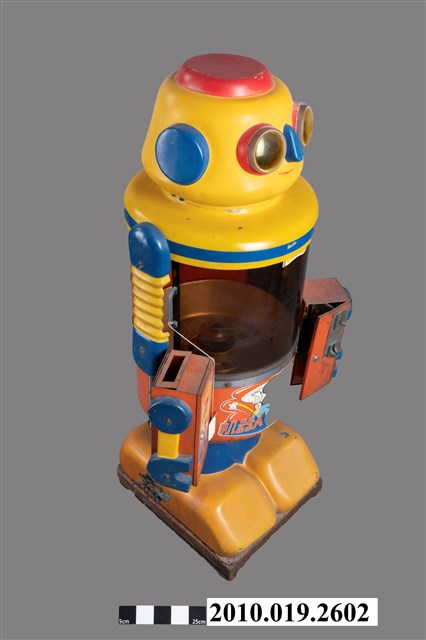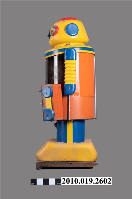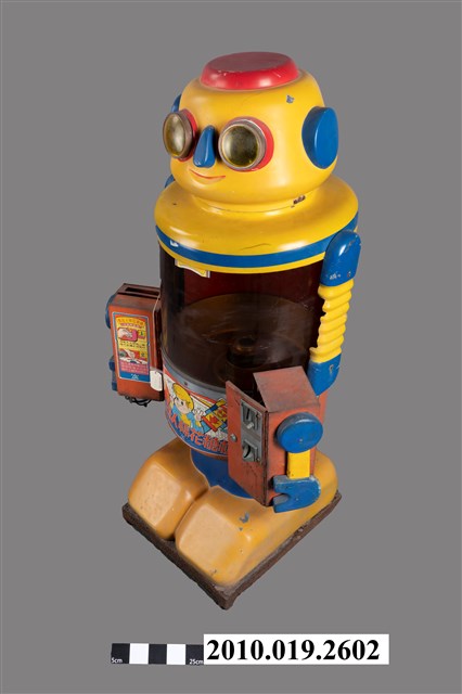 1.本件是機器人棉花糖機,是電動製作棉花糖的專門機器,機器下方附有電線和插頭。外觀呈機器人形狀,具有黃色的裝飾頭部,頭頂、眼框和嘴唇塗紅色漆,兩耳、鼻子塗藍色漆、眼睛以半透明的黃色塑膠為飾;底部為藍色圓柱和黃色的腳底,整體為具有童趣的撞色設計。機器主要操作區域為中間的器身,器身有紅色半透明壓克力罩,邊緣附有把手,可拉開壓克力罩製作棉花糖。本件棉花糖機採投幣式,機身一側附有投幣孔,另一側則貼附操作說明:「機器人棉花糖機 自助販賣機 1持新五元硬幣一枚投右邊之投幣口 2從左邊箱中取出竹箸順時鐘方向旋轉如上圖所示即可」,供遊客投幣後自助操作。2.棉花糖的成份為純糖,使用機器製造的過程大致是:將固態糖粒倒進機器中加熱成液體,融化成糖漿後經過機器旋轉的離心力作用下,糖漿被甩出,在空氣中再次凝結成固態糖絲,使用竹籤在機器中旋轉收集糖絲,即為市集中常見的棉花糖。棉花糖機的發明出自於美國的威廉莫裏森(William J Morrison)和約翰沃頓(John C Wharton),兩人於1897年申請專利,兩人並在1904年的聖路易斯世界博覽會上販售棉花糖而引起轟動,當時的機器製作原理也一直沿用迄今。