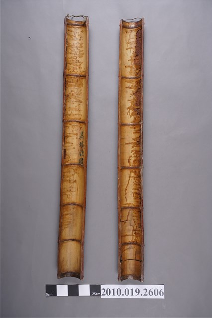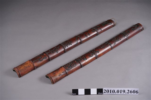 1.此竹楹聯對組為2件成對之藏品,係以單根粗壯竹身剖半後,分別作2件楹聯,正面保留原本竹皮,採陰刻方式製作,上端附有鐵絲,方便懸掛。上聯為「野無餓莩誇皇國」,底部題記「野里先生惠存」,下聯為「里有仁人燦帝邦」,底部題記「子淵書」,旁有印二枚。字內填上黑色塗料。背面保留原始竹子之淺黃褐色,上聯刻有「吳瑞欽贈」字樣。2.竹楹聯又稱對聯,或稱此君聯,因竹子有節,自古便象徵君子氣節。楹聯多以竹、木或石材雕鑿,主要裝飾於廳堂之柱面。竹製楹聯則多裝飾於園林亭閣,或常見於書齋等處。其字句多表格言或心境,需字數相同,平