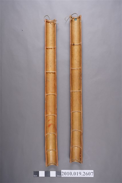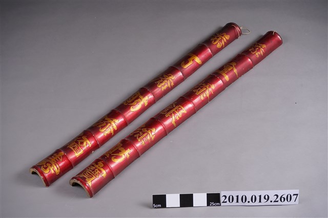1.此竹楹聯對組為2件成對之藏品,係以單根粗壯竹身剖半後,分別作2件楹聯,正面保留原本竹皮,上以紅漆,上端附有繩索,方便懸掛。字體採陰刻方式製作,上聯為「添金添銀添財寶」,下聯為「添丁添財添福壽」,字內填上金色塗料,紅底金字使得視覺效果更為強烈,也更具傳統吉祥之感,背面保留原始竹子之淺黃褐色。