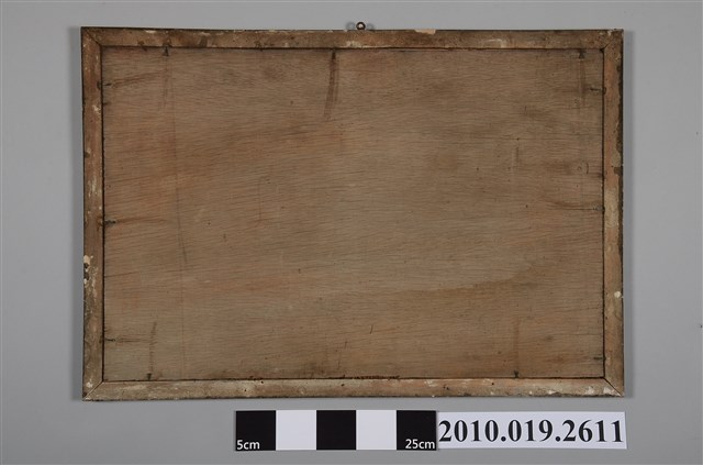1.本件玻璃畫為長方形橫幅,裱深褐邊花邊木框成為畫幅,上方中央有一圓環,可掛於牆上做為裝飾。畫作四周以綠色和金色作一寬邊框,框內右方為收起的布幕,可見此為戲臺場景,檯上有三名人物,中央為頭戴紗帽的冠(官)生,左方為背插靠旗的武生,右方為頭戴雉領的大將,推測為劉備、關羽、張飛桃園三結義。畫面四周有些許漆剝落的痕跡。