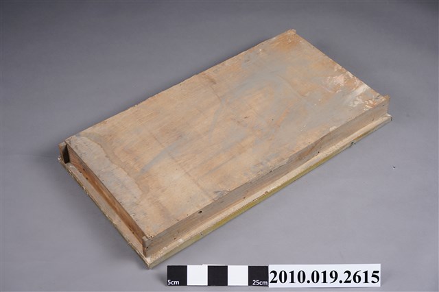 1.本件風景玻璃畫為長方幅,裱紅漆花邊褐色木框成為畫幅,漆部分剝落,木框上方右邊有一圈環,推測左邊原本應該也有圈環,可掛於牆上做為裝飾,上方木框內側寫有「一等」二字。畫作採用二層方式營造出層次感,上層四周以淺黃色作一長方形圓角花邊框,右側有大片漆剝落,框內左側繪一長橋與樹叢,橋的入口處站有一人,橋的盡頭有二棟紅色高樓,下層描繪湖水、樹叢與一棟黃色高樓作為背景。畫面上方寫有紅色「新婚誌喜」四字,左側邊框處寫有「敬賀」二字,可知此為致贈新人的賀禮,不過上方姓名部分已消失難以辨識。