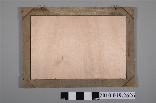 1.本件河畔風景玻璃畫為長方形橫幅,裱金綠漆花邊木框成為畫幅,上方釘有二個掛勾,可掛於牆上做為裝飾。畫面四周以白色作一寬邊框,框內描繪河畔風景,河畔有三艘小船,畫面右方近景繪有二棵高聳的棕櫚樹,河的對岸繪有紅頂白牆房舍、樹叢與遠山。2.玻璃畫又稱為玻璃彩繪,屬於民間的平面藝術,使用毛筆沾油漆在平板玻璃背面作畫。臺灣的玻璃彩繪約始於日治時期,光復後受到工業化量產的影響開始流行於一般階層,約於民國40、50年代達到鼎盛時期。玻璃畫的題材多帶有吉祥意味,常用來作為祝壽、婚慶、新居落成、商店開張等誌喜之賀禮。