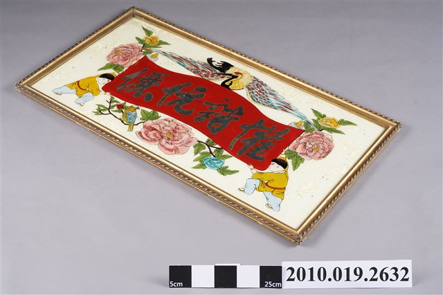 1.本件「權偕伉儷」玻璃畫為長橫幅,裱銅色漆花邊木框成為匾額,上方釘有二個掛勾,可掛於門楣或廳堂做為裝飾。以白色為底,畫面中央由二名童子手持的紅色捲軸上寫有「權偕伉儷」四個大字,捲軸上方繪有一隻展翅的丹頂鶴,左右與下方圍繞彩色牡丹花和一支白頭翁,皆帶有吉祥的意味。