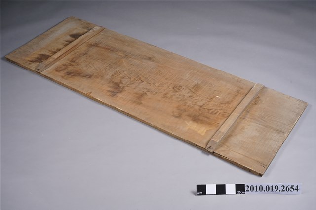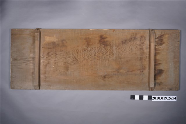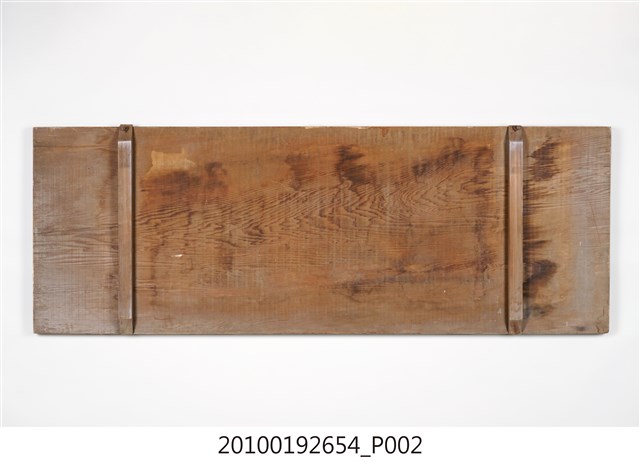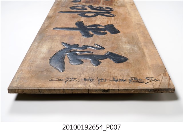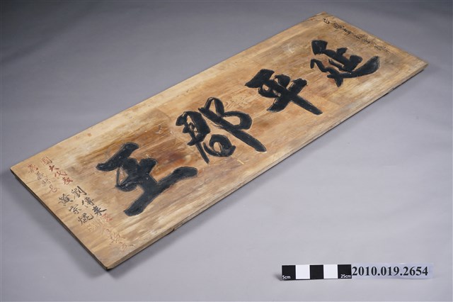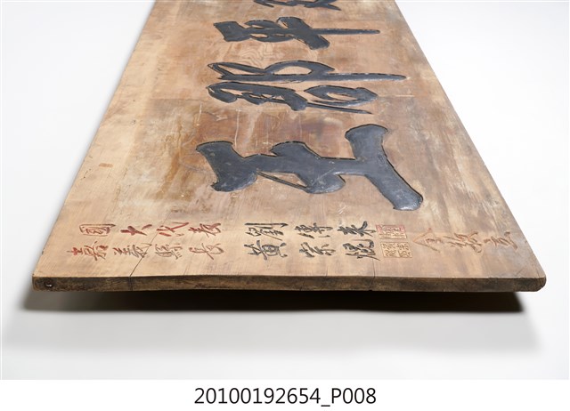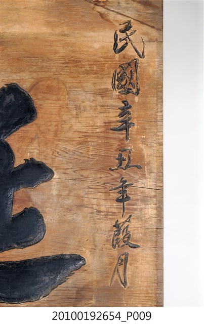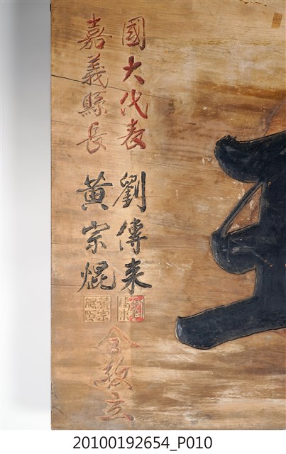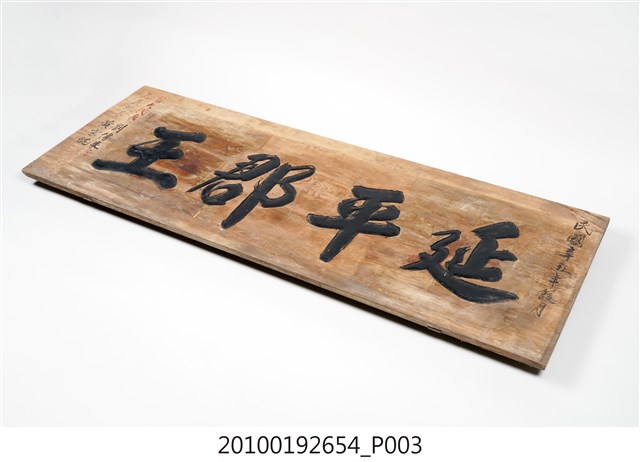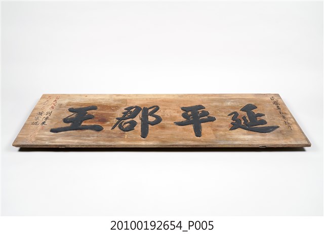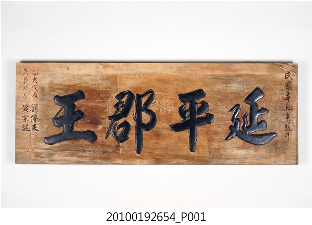 1.本件為民國50年國大代表劉傳來嘉義縣長黃宗焜贈「延平郡王」木匾,右端為陽刻上款「民國辛丑年葭月」,中央為四大字陽刻匾文「延平郡王」,左端下款「國大代表劉傳来 嘉義縣長黃宗焜同敬立」。匾額之文字多為黑色墨書,僅下款除人名外為朱書,下款人名之下還刻有姓名印章。除文字外,匾額通體不上漆,表現顯現木材之紋理,背面有二根垂直木條,用以加固匾額結構。