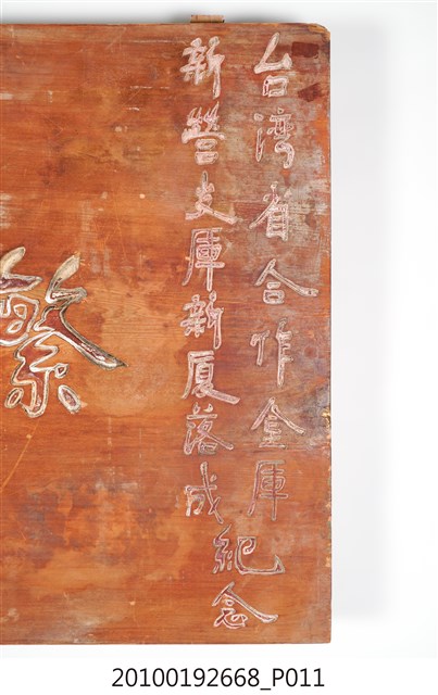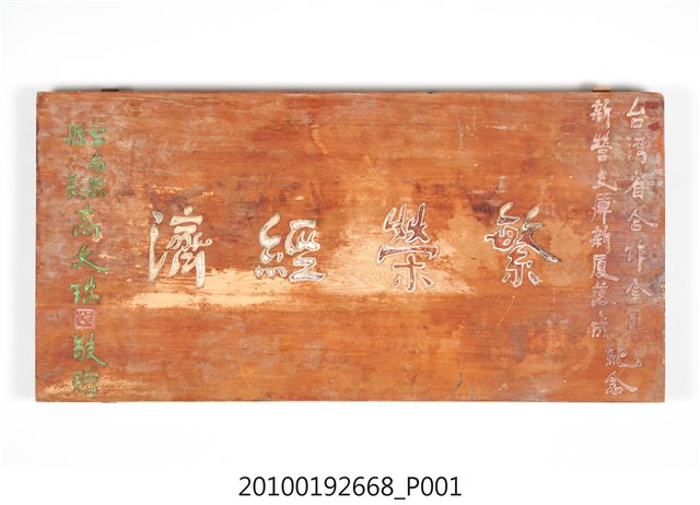 1.本件為臺南縣縣長高文瑞贈臺灣省合作金庫新營支庫「繁榮經濟」木匾,右側上款陽刻「台湾省合作金庫新營支庫新廈落成紀念」,中央陽刻行書匾文「繁榮經濟」四個大字,左側同樣陽刻下款「台南縣縣長高文瑞敬贈」,高文瑞名字下方刻有隸書「高文瑞印」一枚。匾額正面施紅漆,下款文字現為綠漆,背面不施漆,有兩個垂直木條用來加固匾額整體結構。