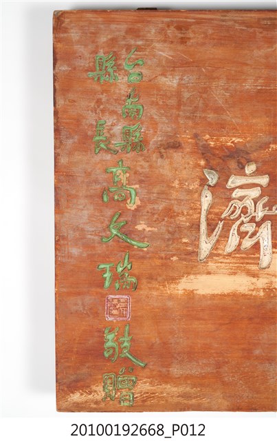 2.下款贈匾人高文瑞為臺南將軍人,1894年出生於當地望族,1919年臺灣總督府國語學校師範部畢業後,陸續擔任學甲公學校、蕭壠公學校之訓導。1924年出任佳里庄助役與庄協議會副議長,1928年擔任佳里庄庄長,是日治時期臺南地方重要的政治人物與仕紳。戰後仍活躍於政治界與教育界,曾參與創辦北門中學,後當選第一任與第二任臺南縣縣長,任期由1951年至1957年,此匾額即在此時致贈給合作金庫新營支庫。