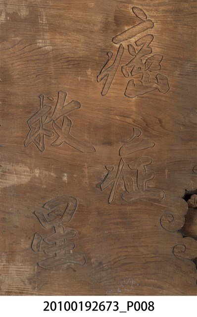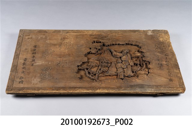 1.本件為民國49年臺南佳里鎮東興里葉戴罔受贈孫錦醫師「癌症救星」浮雕木匾,匾額以一塊木板製成,通體無上漆,背面有兩根垂直木條加固,邊框雕刻有花草波浪紋,匾額邊緣輕微受損。