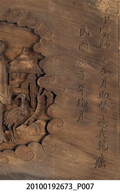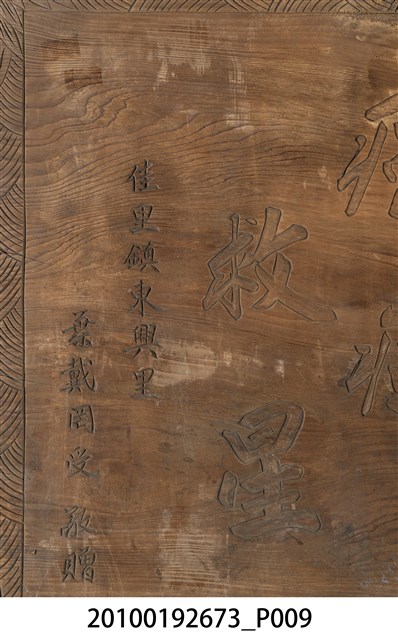 2.匾額右側上款文字「孫錦中醫師 史金月助醫癒我乳癌 民國庚子年梅月」,其左為剔地淺浮雕之孫思邈針龍圖,右側是作老者打扮的唐代著名醫孫思邈,右手高舉一筆,其左上方有一龍回首盤旋雲彩之中,孫思邈前方有一手托硯臺之小童子,童子左側則雕有松樹,孫思邈背後則雕有一鶴鳥。背景部分則在右側雕有茅草亭子,左側則是簡單刻畫了遠山。浮雕的左側則陽刻有「癌症救星」四大字。其左陰刻有下款「佳里鎮東興里葉戴罔受敬贈」。