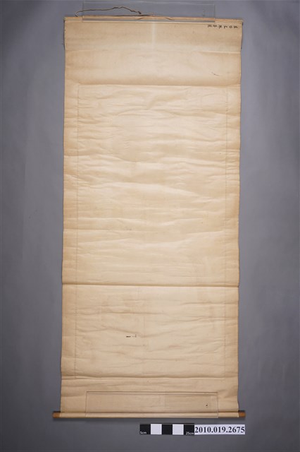 1.本物件為文殊菩薩功德畫掛軸,有畫心、托紙、畫杆、扎帶;畫心彩繪文殊菩薩像,頭戴牡丹花冠,五官端正,肌肉飽滿,雙目半睜,眉毛細長高挑,耳垂厚實,頂上圓光,胸配瓔珞,身披敞胸結帶的寬袖披肩袍服,衣端鑲邊,衣上織錦紋,圖案華麗,右手在下,左手上,雙手持如意繫經冊,下身著裙裳,雙足結半迦趺坐於青獅背上,白象下方繪靈芝、蓮花、雲多等圖紋。掛軸的地腳貼小張紅紙,書寫「鍾陳秀妹鍾林連妹同敬献」;覆背墨書註記「左幅紋殊菩薩」。
