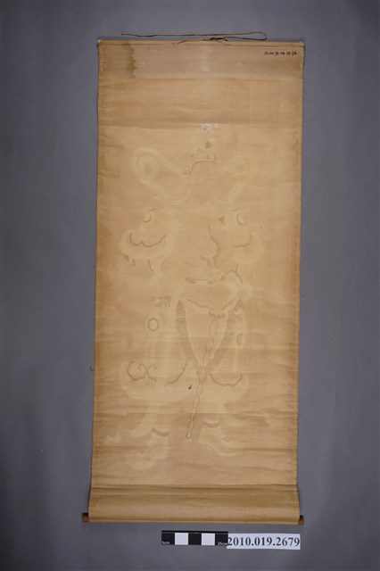 1.本物件為韋馱菩薩功德畫掛軸,有畫心、托紙、畫杆、扎帶;畫心彩繪韋馱菩薩立像,頭戴盔帽,粉臉無鬍,柳眉鳳眼,頂上圓光,身披綬帶,穿戰甲,足登馬靴成丁字馬,右手持金剛杵拄地,左手插腰。掛軸的地腳貼小張紅紙,書寫「鄭劉素辰鄭游娘妹陳煥妹同敬献」;覆背墨書註記「左幅韋馱菩薩」。
