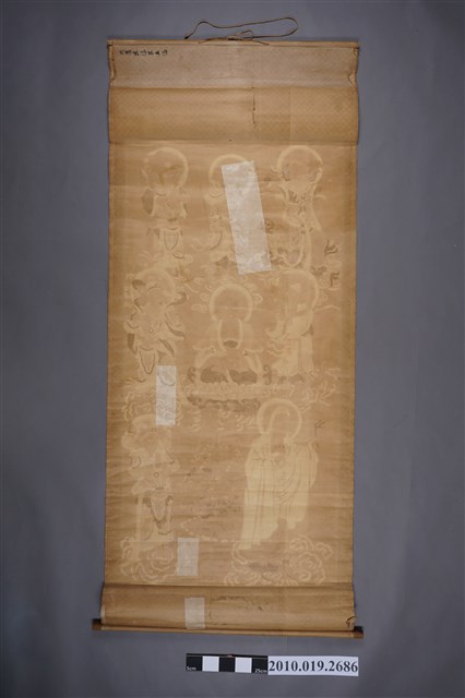 1.本物件為大悲出相第五幅,為卷軸狀,把紙黏連成長幅,上下端各有一根短棍將紙捲住,從上到下卷成一束,本捲軸底色為咖啡色,上面貼有米色紙,以墨水畫出8尊菩薩的樣式,菩薩中有以正面有以側面,腳下皆騰雲,並在旁邊寫有菩薩的說明,卷軸最下方並貼有一張方形紅紙,紙上寫有「林良妹、溫丁妹、涂阿倉、劉添連、曾運妹」同敬献。