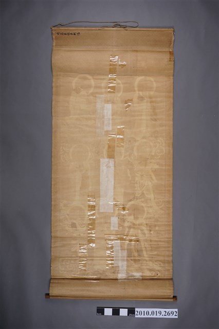 1.本物件為大悲出相第八幅,為卷軸狀,把紙黏連成長幅,上下端各有一根短棍將紙捲住,從上到下卷成一束,本捲軸底色為咖啡色,上面貼有米色紙,以墨水畫出9尊菩薩的樣式,菩薩中有以正面有以側面,有些手上持有法器,腳下皆騰雲,每尊菩薩旁邊皆有說明,以3、3、3的方式排列,卷軸最下方並貼有一張方形紅紙,紙上寫有「廖榮妹、劉許研、郭瑞英」同敬献。