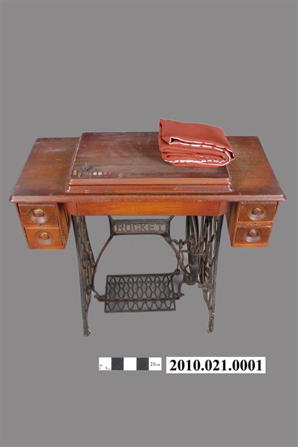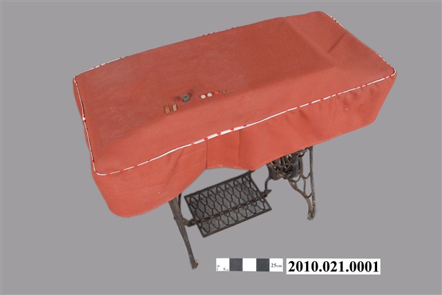 本文物為曉(原文:AKATUKI)牌腳踏式裁縫機,金屬機體,附木質工作桌板及收納抽屜、金屬支腳及踏板。本體結構、木製收納抽屜與裝載機體皆狀況良好。1790年英國人湯瑪斯‧聖特(Thomas Saint)為提高製鞋效率設計手搖裁縫機,在多次的改良之下,時至1853年多數家庭使用之腳踏裁縫機才出現。而傳統家庭中的縫紉工作多由女性擔任,因此縫紉機出現反映女性生活與科技互動,所產生工作型態之改變。