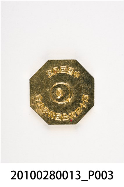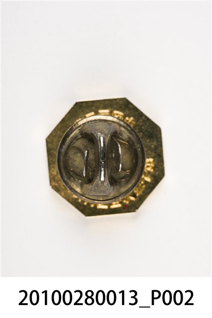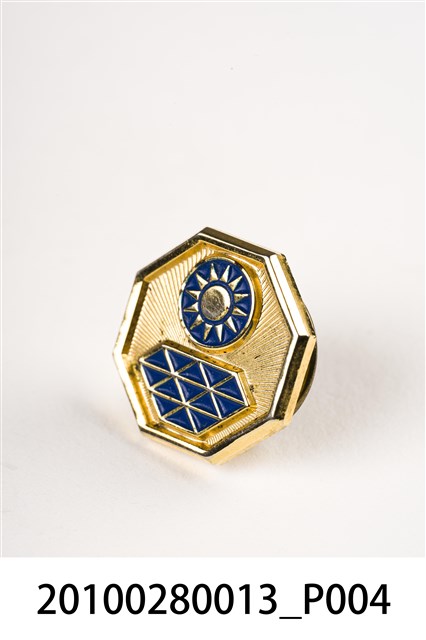 此物件為紀念章,形式為八邊形胸針,內有中國國民黨黨徽以及鑽石形圖樣。此為劉樹森所有之中國國民黨第十三次全國代表大會紀念章 本物件的持有人為劉樹森(1913-2008),為臺南市的第六屆議員,他出生於河南省信陽縣,畢業於河南開封甲等工專,後投筆從戎加入軍隊,並先後擔任陸軍少將師長、河南省信陽縣長暨成防司令,另也曾擔任團主任支隊司令、團主任團長、代理縣長。劉樹森來臺後定居於臺南,並擔任國民黨臺南市黨部第二組長,女兒為曾經擔任成功大學外文系主任的劉開鈴。 中國國民黨在臺灣之統治,始於二戰後的接收時期。1945年日本於太平洋戰爭中戰敗投降,國民政府設置臺灣省行政長官公署負責臺灣的接收事務,並透過「三民主義青年團」、「國民黨臺灣省執行委員會」、「國民黨臺灣省黨部」等機構穩固社會各方面的統治基礎。1950年代,中國國民黨施行多次黨務改造,透過黨員大會、各級黨員代表大會,以及黨內各級委員會之層層建置,使其動員機制深入地方社會。