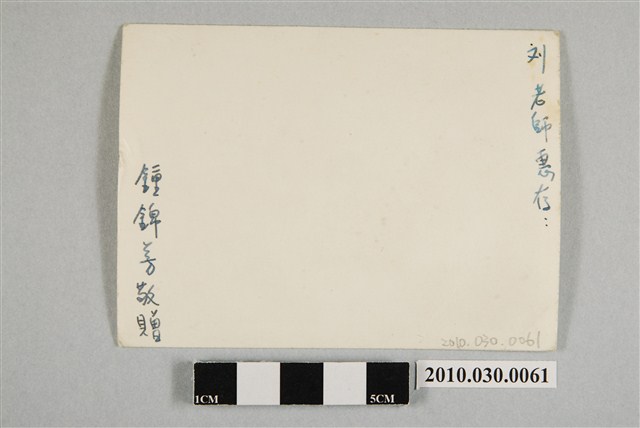 本物件為照片,黑白樣式。由照片正面可見拍攝地點位於室內,該空間的牆面設置1面窗戶,窗台則有1個盆栽。該照片共有5人入鏡,5名人士圍坐1張桌子,左1、左4人士背對鏡頭,左2、左3、右1望向左1人士。該張桌子上可見5個淺色杯子、1個菸灰缸。照片背面右上方可見「刘老師惠存」字樣,左下方可見「鍾錦善敬贈」字樣。
