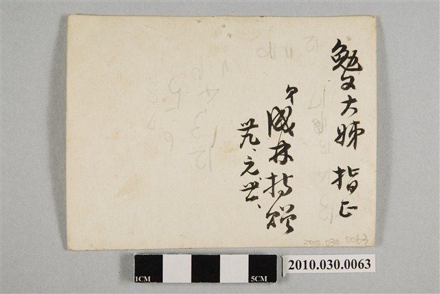 本物件為成林技贈明信片,背面有以墨筆手寫有「勉文大姊 指正」字樣,也有鉛筆書寫數字的字樣,正面圖案為以燈籠、炮竹、月曆、農民曆以及祝賀文所構成的畫面。