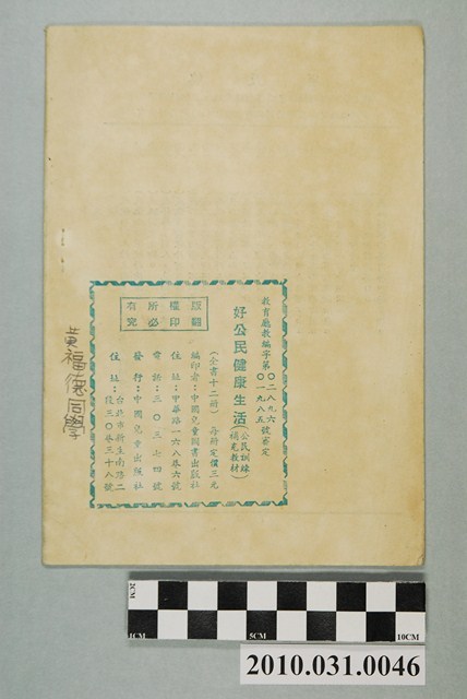 本文物為國民學校公民訓練補充教材十二冊中之第八冊,封面印有學生守時、禮節、生活習慣、升旗等圖並以紅色字體由右至左印有「教育廳審定國民學校公民訓練補充教材好公民健康生活(公民訓練衛生教育安全教育生活指導)第八冊」;封底版權頁左邊以正楷書寫「黃福德同學」,推測黃福德為書籍所有人。