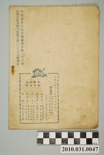 本文物為國民學校公民訓練補充教材十二冊中之第十一冊,封面印有學生升旗等圖並以紅色字體由右至左印有「臺灣省教育廳審定國民學校公民訓練適用第一十冊」並有于右任題字「好公民」;封底為版權頁及審定證號:「台灣省教育廳(46)教編字第○二八九六號審定」、「內政部登記證內警臺業字第二六六號」