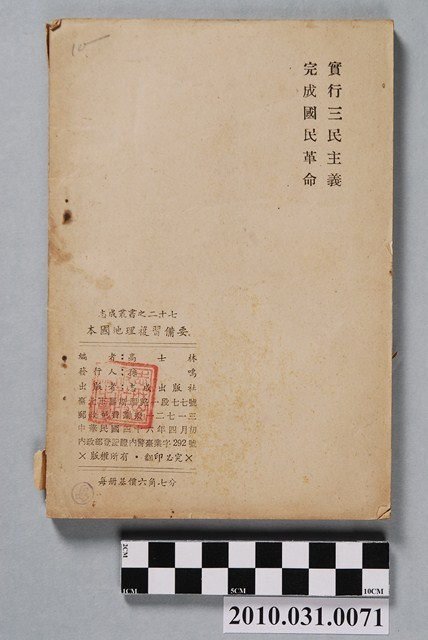 《本國地理複習備要》,編者高士林,發行人孫鳴,志成出版社出版,民國46(1957)年4月初出版。 本書是臺灣戰後初期臺北志成、大同二間補習班的地理教材,搭配高中地理課本的參考書,升大學、高普考適用。本書內容涵蓋當時高中地理的本國地理部分,涵蓋通論地理和區域地理,以表解、綱要和插圖等方式總和課文精華,並收錄大專入學考試、各省市會考及歷屆高普考試題供考生參考。