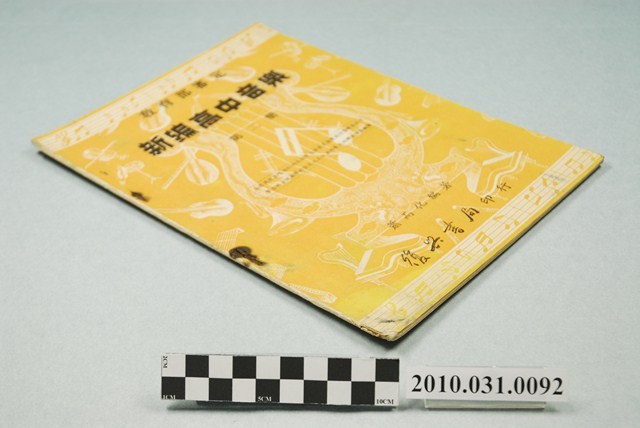 本文物為蕭而化著《教育部審定新編高中音樂第二冊》。封面為橘色底,印有許多音符、樂器圖樣,內容分為練聲、視唱、唱歌及欣賞四部分。
