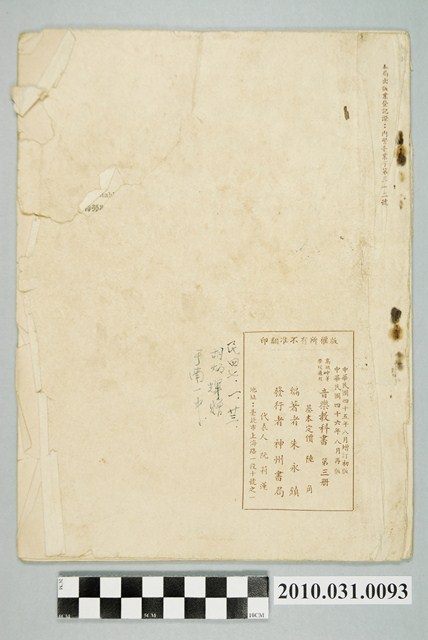本件為教育部審訂、朱永鎮編《高級中等學校適用音樂教科書》,冊次為第3冊,發行時間為民國46年(1957)8月,由臺北市神州書局發行。本書適用於高級中等學校音樂科,內容共分為5部分,分別為:「音樂常識」、「聲樂練習曲」、「視唱」、「歌取」、「音樂欣賞」。