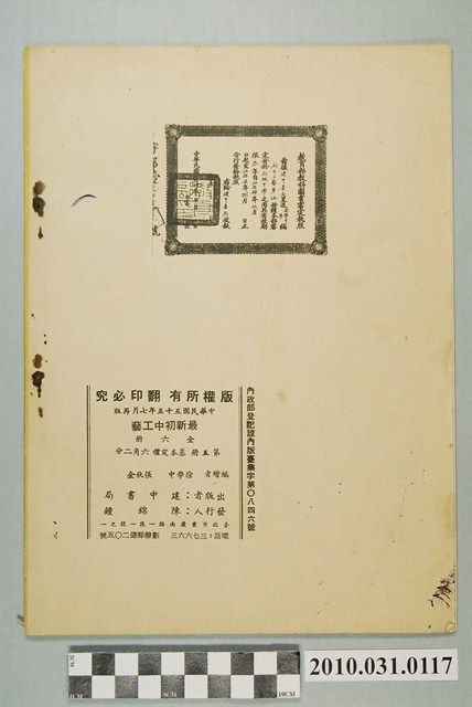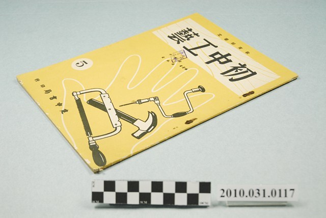 本文物為初中工藝課本全六冊中之第五冊,封面蓋有「金中驗訖」,內為圖文並茂講述「木工」、「金工」、「電工」、「藤竹工」,並有操作、知識及實作作業等各部工藝;內頁另印有教育部教科圖書審定執照。