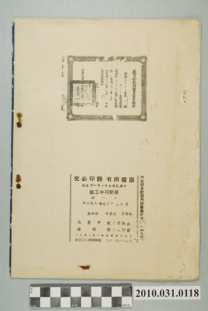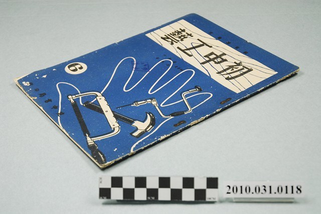 本文物為初中工藝課本全六冊中之第六冊,封面蓋有「金中驗訖」,內為圖文並茂講述「木工」、「金工」、「電工」、「藤竹工」,並有操作、知識及實作作業等各部工藝;版權頁另印有教育部教科圖書審定執照。
