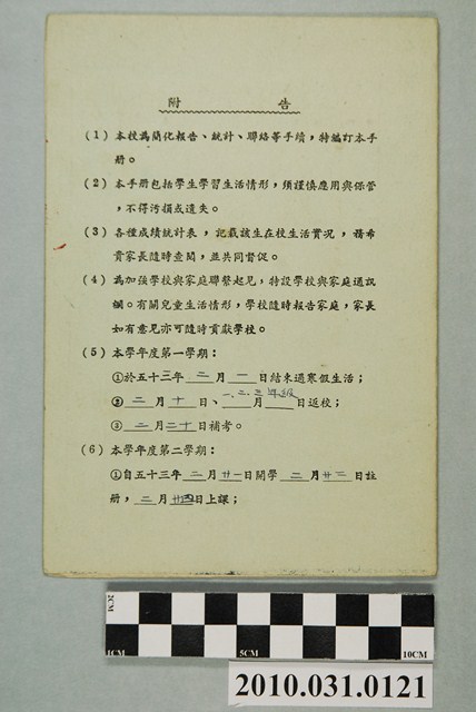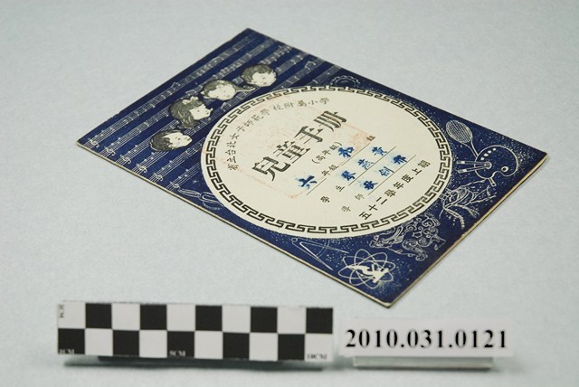1.本文物為省立台北女子師範學校附屬小學高年級學生聯絡簿,為五十二學年度六年和班,導師邢劍秋學生黃燕琴所有;兒童手冊紀錄學生生活情形、成績統計以做為與家長聯絡之用。2.「臺灣總督府國語學校附屬小學校」創立於1913年,光復後改稱為「臺灣省立臺北女子師範學校附屬小學」,爾後經歷師範學校改制為師專、師院,校名皆有變更。師院改制為教育大學後,更名為「臺北市立教育大學附設實驗國民小學」,2013年再次更名為「臺北市立大學附設實驗國民小學」。