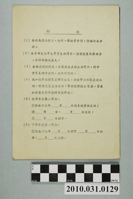 1.本文物為省立台北女子師範學校附屬小學高年級學生聯絡簿,為五十二學年度下學期六年和班,導師邢劍秋學生黃燕琴所有;兒童手冊紀錄學生生活情形、成績統計以做為與家長聯絡之用。2.「臺灣總督府國語學校附屬小學校」創立於1913年,光復後改稱為「臺灣省立臺北女子師範學校附屬小學」,爾後經歷師範學校改制為師專、師院,校名皆有變更。師院改制為教育大學後,更名為「臺北市立教育大學附設實驗國民小學」,2013年再次更名為「臺北市立大學附設實驗國民小學」。