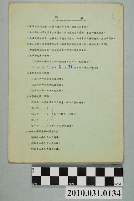 1.本文物為省立臺北女子師範學校附屬小學高年級學生聯絡簿,為五十五學年度第二學期五年和班學生黃衍成所有(導師李長恭);兒童手冊紀錄學生生活情形、成績統計以做為與家長聯絡之用。2.「臺灣總督府國語學校附屬小學校」創立於1913年,光復後改稱為「臺灣省立臺北女子師範學校附屬小學」,爾後經歷師範學校改制為師專、師院,校名皆有變更。師院改制為教育大學後,更名為「臺北市立教育大學附設實驗國民小學」,2013年再次更名為「臺北市立大學附設實驗國民小學」。
