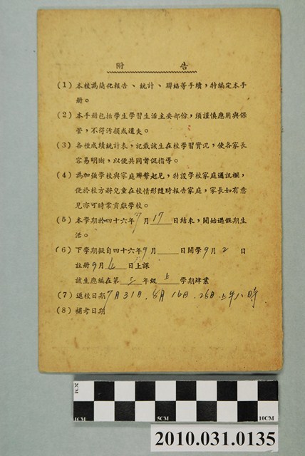 1.本文物為省立臺北女子師範學校附屬小學低年級學生聯絡簿,為四十五學年度第二學期二年義班學生黃衍明所有(導師張小惠);兒童手冊紀錄學生生活情形、成績統計以做為與家長聯絡之用。2.「臺灣總督府國語學校附屬小學校」創立於1913年,光復後改稱為「臺灣省立臺北女子師範學校附屬小學」,爾後經歷師範學校改制為師專、師院,校名皆有變更。師院改制為教育大學後,更名為「臺北市立教育大學附設實驗國民小學」,2013年再次更名為「臺北市立大學附設實驗國民小學」。