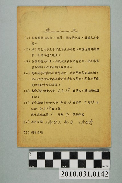 1.本文物為省立台北女子師範學校附屬小學低年級學生聯絡簿,為四十七學年度第一學期一年忠班學生黃燕琴所有(導師林瓊葉);兒童手冊紀錄學生生活情形、成績統計以做為與家長聯絡之用。2.「臺灣總督府國語學校附屬小學校」創立於1913年,光復後改稱為「臺灣省立臺北女子師範學校附屬小學」,爾後經歷師範學校改制為師專、師院,校名皆有變更。師院改制為教育大學後,更名為「臺北市立教育大學附設實驗國民小學」,2013年再次更名為「臺北市立大學附設實驗國民小學」。