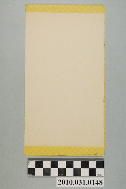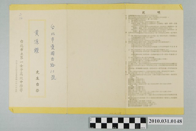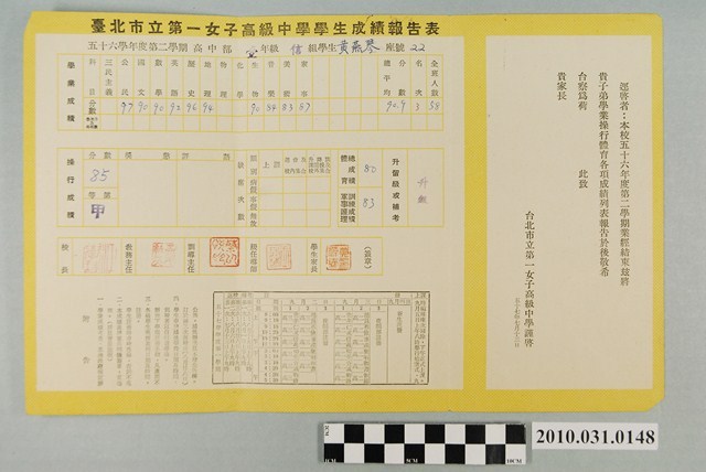 本文物為北一女中五十六學年度第二學期一年信班學生黃燕琴成績單,成績單為三摺頁信封式,寄件單位為「台灣省立台北第一女子中學夜間部附設女子補習學校」及「校址:台北市重慶南路一段一六五號」;封面署名家長「黃源鑅」及地址「台北市愛國西路10號」及成績單說明;背面為校面呈啟家長說明「學業」、「操行」及「體育」各項成績報告,並有校方自校長、教務主任、訓導主任、級任導師、學生家長各章。