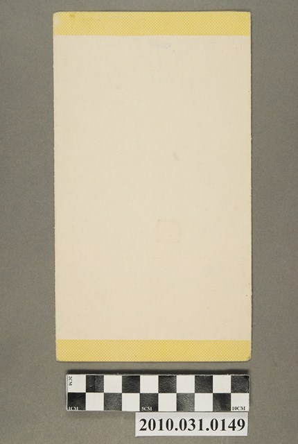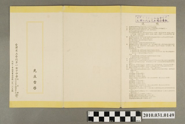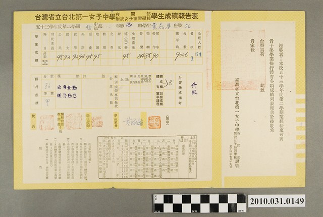 本文物為北一女中五十三學年度第二學期初中部一年忠班學生黃燕琴成績單,成績單為三摺頁信封式,寄件單位為「台灣省立台北第一女子中學夜間部附設女子補習學校」及「校址:台北市重慶南路一段一六五號」;背面為校方呈啟家長說明「學業」、「操行」及「體育」各項成績報告,並有校方自校長、教務主任、訓導主任、級任導師、學生家長各章。