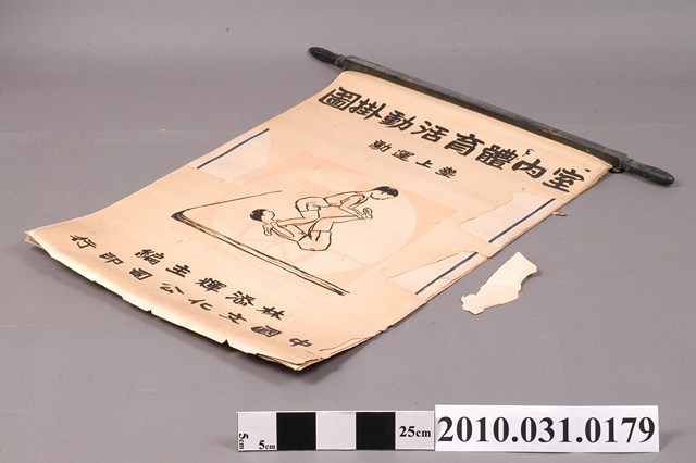 本件為本件為全國體育設計委員會委員暨宜蘭縣冬山國民學校長林添輝主編,中國文化公司印行之《室內體育活動掛圖》,主題為:「墊上運動」,彩色印刷,出版年代不詳,由畫家林添輝主編,中國文化公司印行,圖上附木製掛軸。封面印有「室內體育活動掛圖 墊上運動」、「中國文化公司印行」字樣。