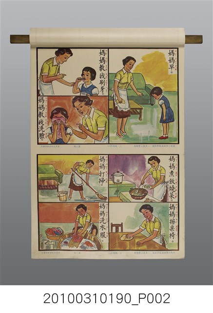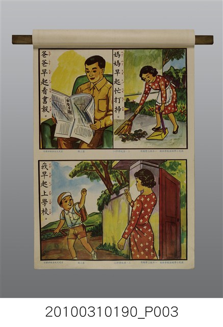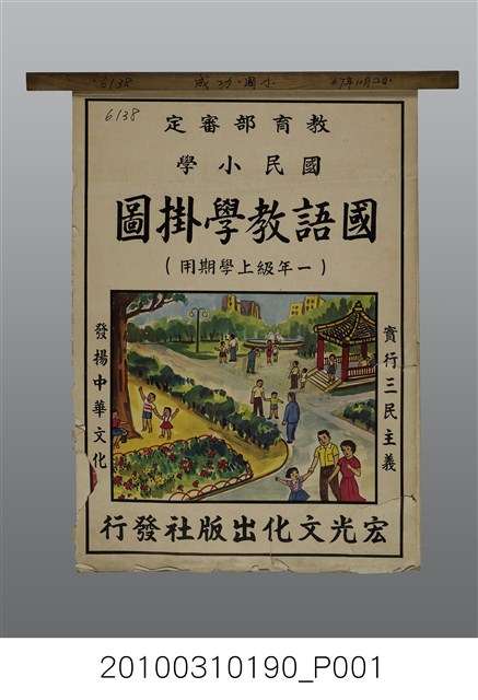 本件為宏光文化出版社印行《國民小學國語教學掛圖》,供一年級學童上學期課程使用,彩色印刷,封底版權頁已佚失,發行時間不詳,推測為民國67年(1978),圖上附木製掛軸,掛軸上有「6138」、「成功國民小學」、「67年10月2日」等字樣,封面可見「實行三民主義 發揚中華文化」標語,掛圖共計15圖,每圖附有課文,字旁以紅筆標上注音符號,內容包括:起床、盥洗、上學校、書包、老師上課、踢皮球、小黃狗、小鳥、龜兔賽跑、國父孫中山、公園、火車過山洞、船舶等。