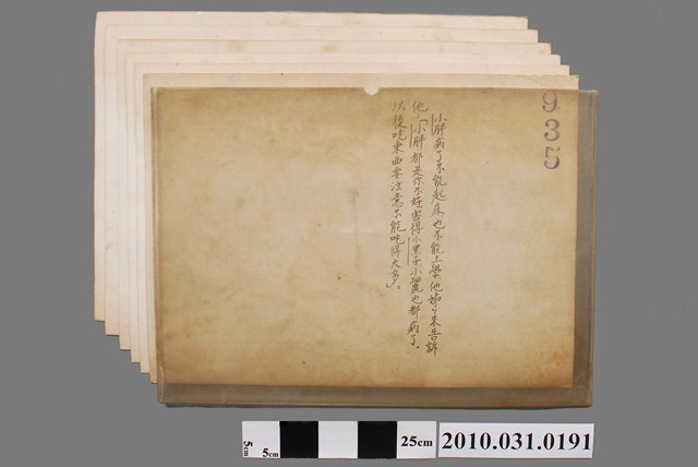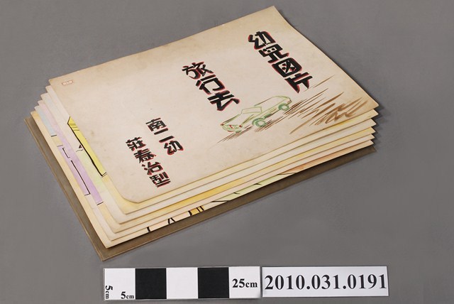 本組物件為南二幼莊春治製《幼兒圖片旅行去 》,含有六張圖卡,以一個L型夾包裝。每張皆有圖案或文字,內容描述三名孩童,出遊時吃太多東西導致身體不適的故事,用以勸導孩童適量進食。