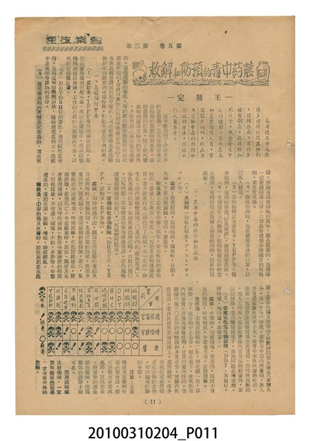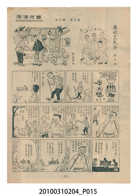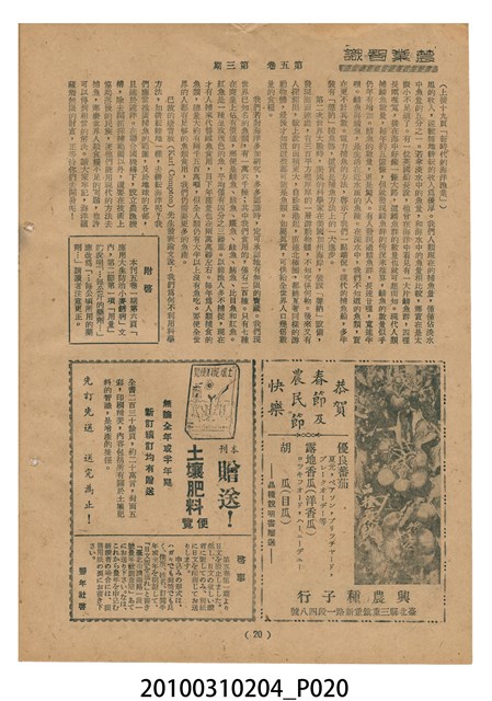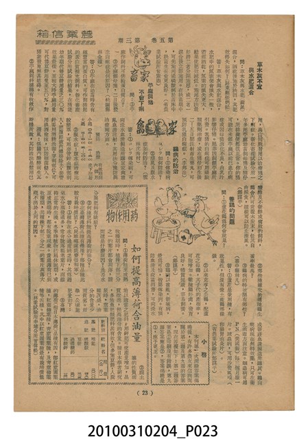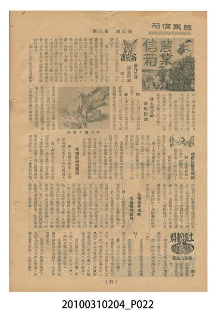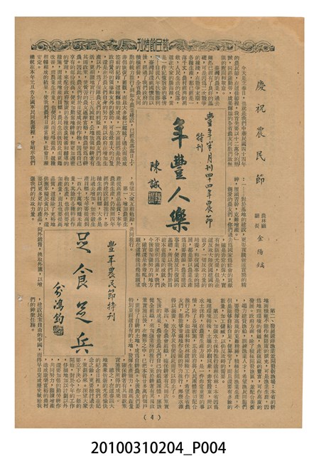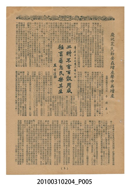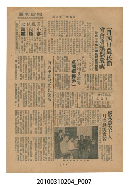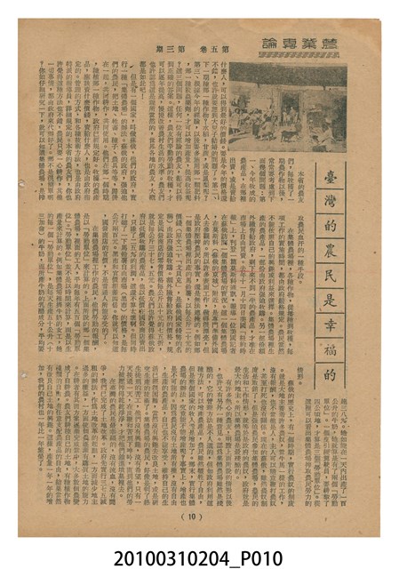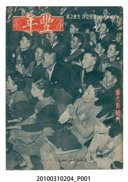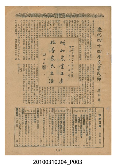 1.本物件為《豐年》雜誌第5卷第3期。封面、封底均用彩色印刷。封面以農民節大會照片為底圖,為胡漢錦攝,左上部印期刊名,右上部由右而左橫印「第五卷第三期 農民之友 生產之道」,右下緣以橘色字直印「農民節特刊」,正下緣由右而左橫印「中華民國四十四年二月一日」。封底以小雞覓食照片為底圖,為黃金樹攝。左半部載定價及登記、發行、印刷等相關資訊,左上角印有豐年社的商標。封面內頁刊登新聞照片選輯。內文首頁下半部為目錄,上半部為社長蔣夢麟撰寫之「慶祝四十四年度農民節」社論,社論中間有蔣中正題字;次3頁依序有副總統陳誠、行政院長俞鴻鈞、臺灣省主席嚴家淦之題字。收錄文章可分為農民節特輯、農業生產、婦女家庭等3大部分,此外,尚有地方通訊、牛哥漫畫、世界畫報、農業信箱、兒童天地、小說等專欄。