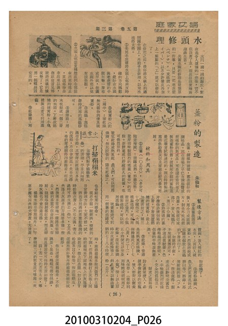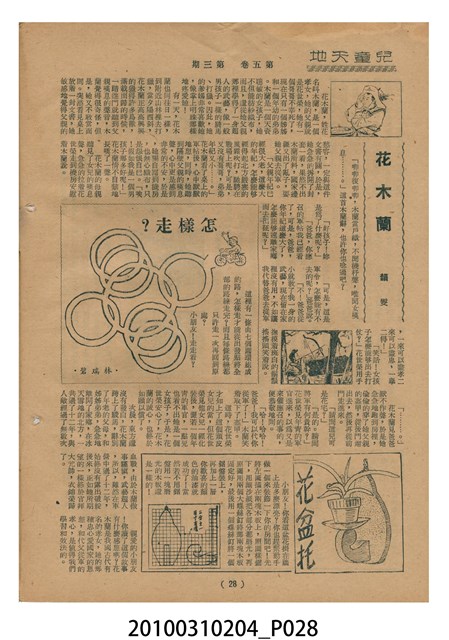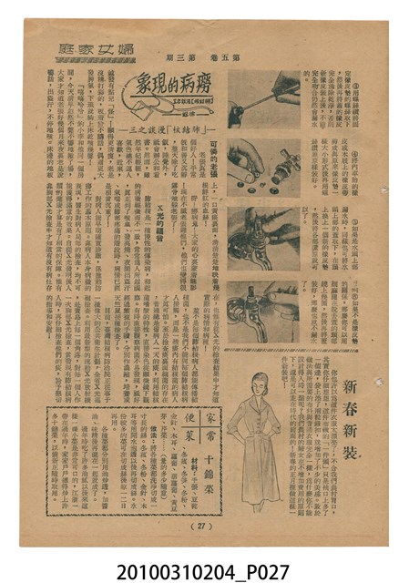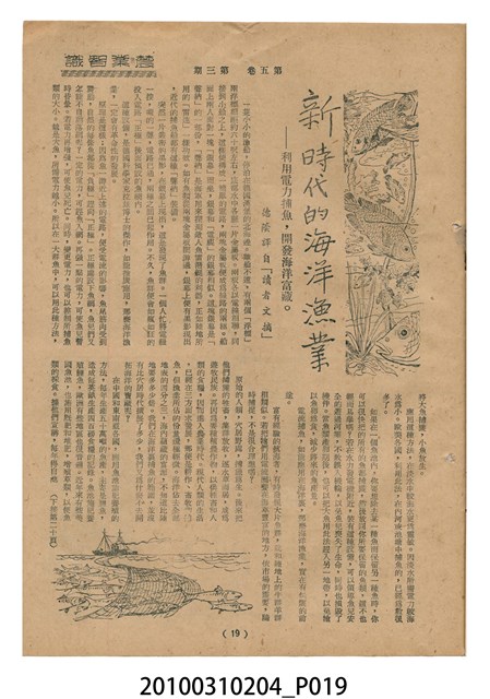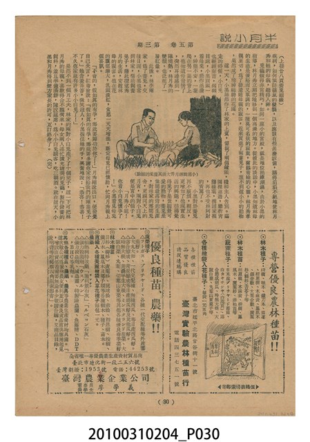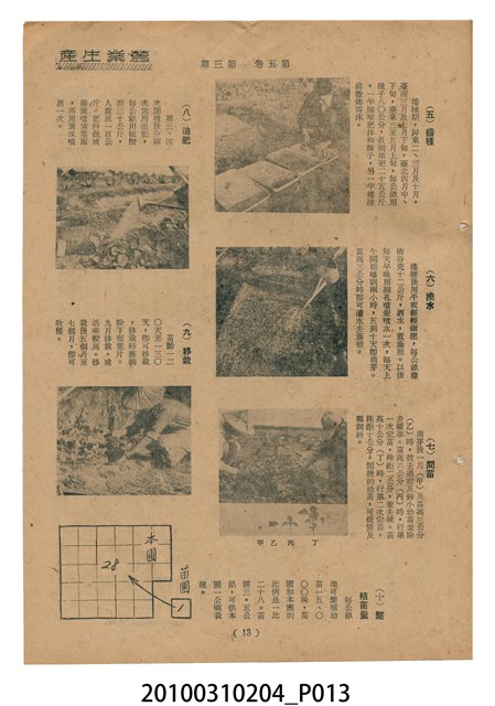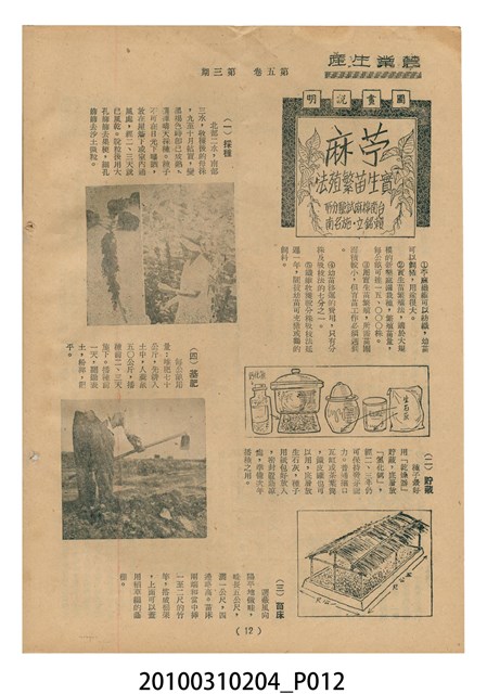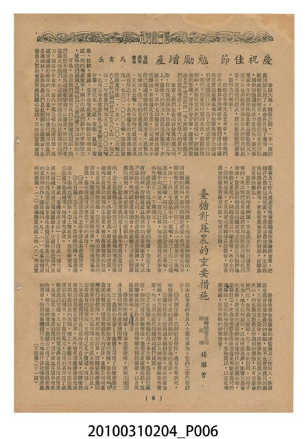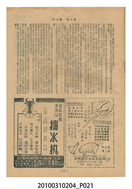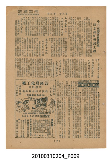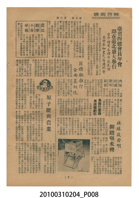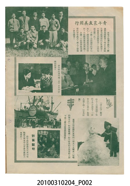 1.本物件為《豐年》雜誌第5卷第3期。封面、封底均用彩色印刷。封面以農民節大會照片為底圖,為胡漢錦攝,左上部印期刊名,右上部由右而左橫印「第五卷第三期 農民之友 生產之道」,右下緣以橘色字直印「農民節特刊」,正下緣由右而左橫印「中華民國四十四年二月一日」。封底以小雞覓食照片為底圖,為黃金樹攝。左半部載定價及登記、發行、印刷等相關資訊,左上角印有豐年社的商標。封面內頁刊登新聞照片選輯。內文首頁下半部為目錄,上半部為社長蔣夢麟撰寫之「慶祝四十四年度農民節」社論,社論中間有蔣中正題字;次3頁依序有副總統陳誠、行政院長俞鴻鈞、臺灣省主席嚴家淦之題字。收錄文章可分為農民節特輯、農業生產、婦女家庭等3大部分,此外,尚有地方通訊、牛哥漫畫、世界畫報、農業信箱、兒童天地、小說等專欄。