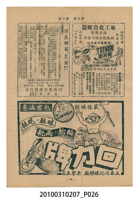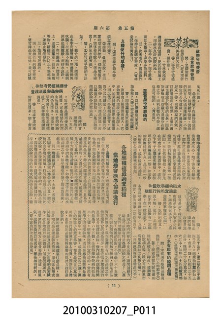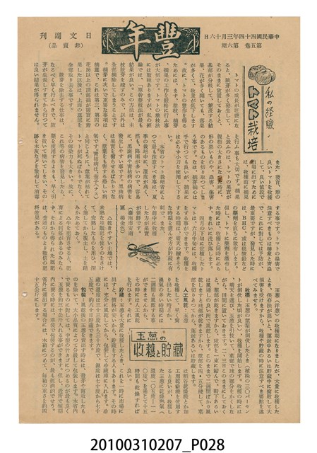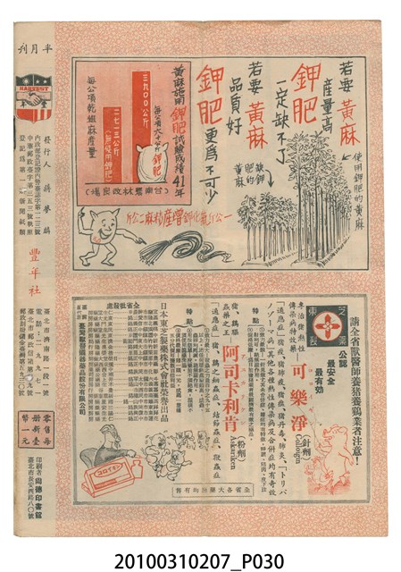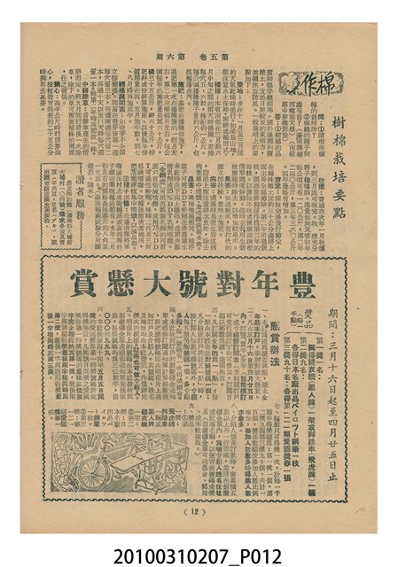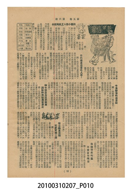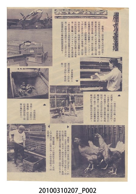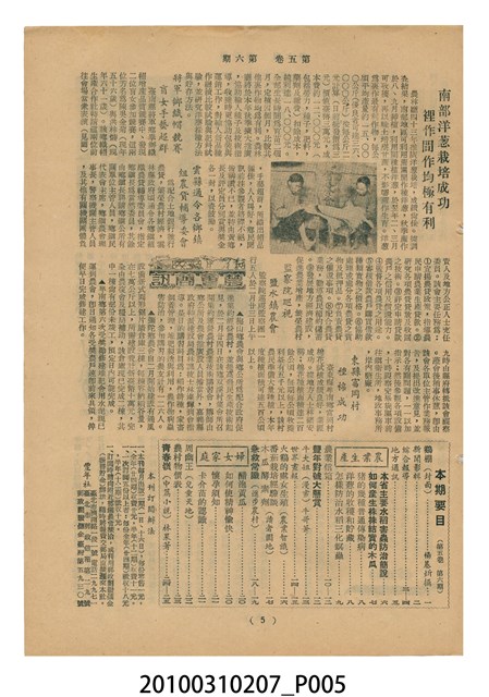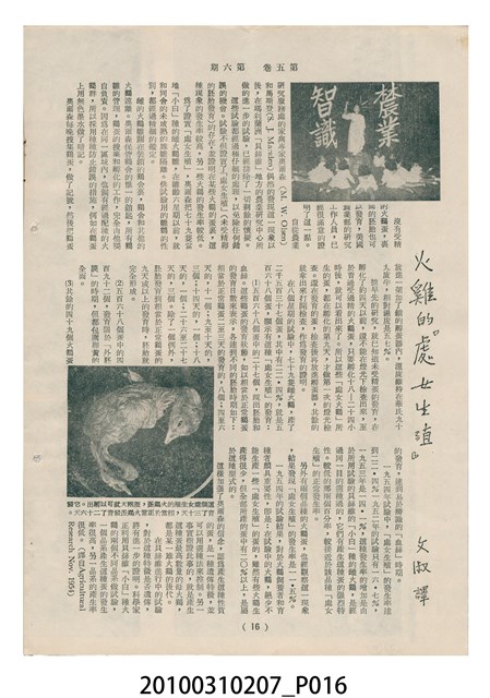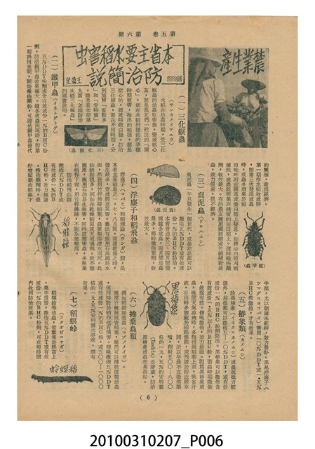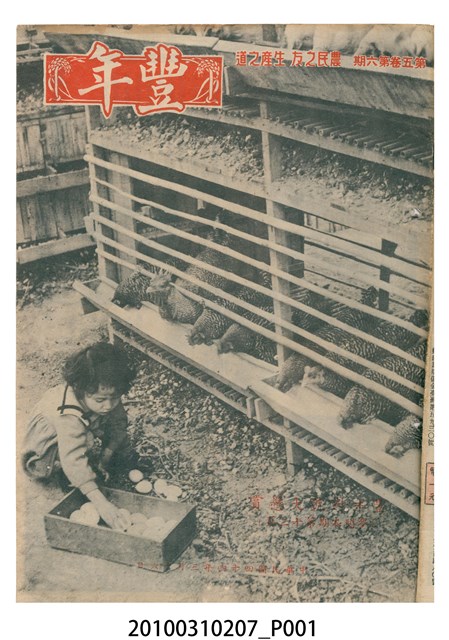 1.本物件為《豐年》雜誌第5卷第6期。封面、封底均用彩色印刷。封面以楊基炘所攝的「雞棚」為底圖。左上部印期刊名,右上部由右而左橫印「第五卷第六期 農民之友 生產之道」,正下緣由右而左橫印「中華民國四十四年三月十六日」。封底左半部載定價及登記、發行、印刷等相關資訊,左上角印有豐年社的商標。內文第5頁下半部為目錄。收錄文章主要為與農畜業相關報導,此外,尚有婦女家庭、兒童天地、小說等專欄。