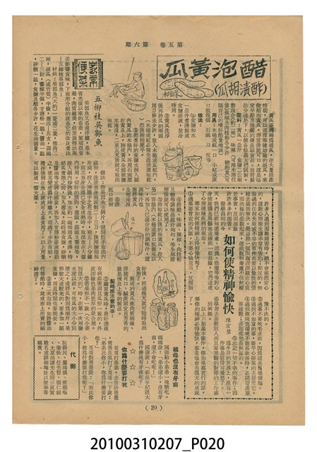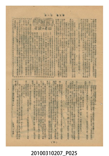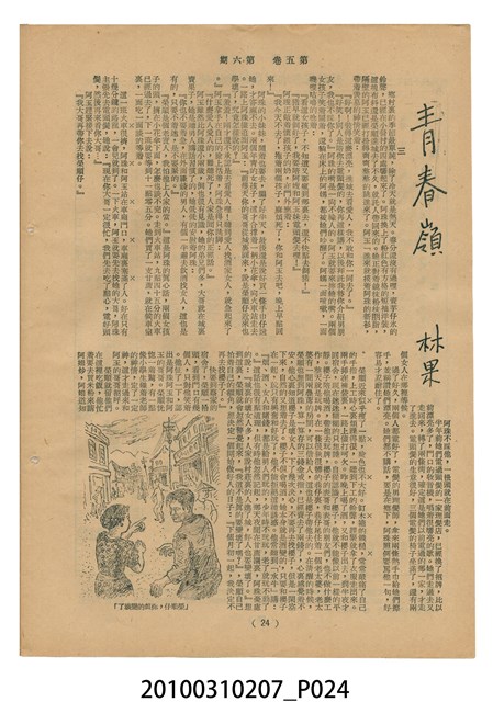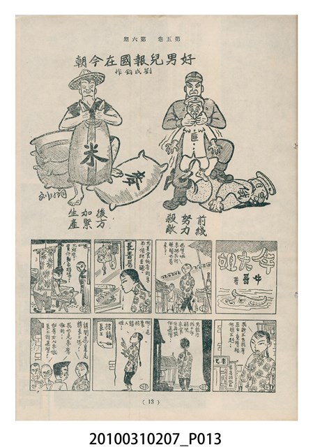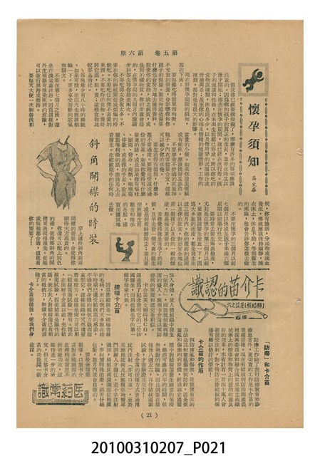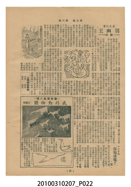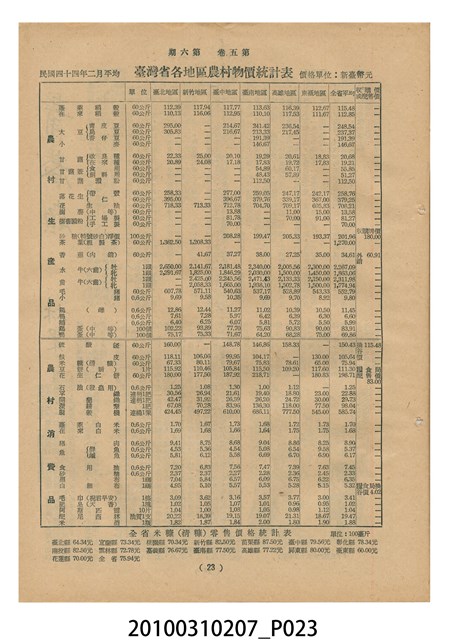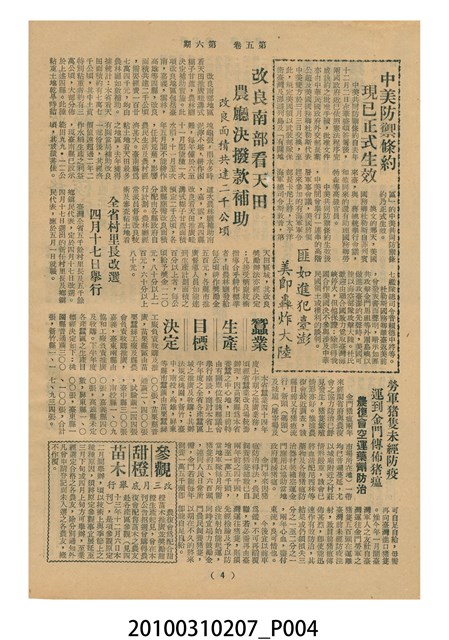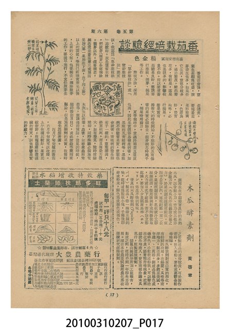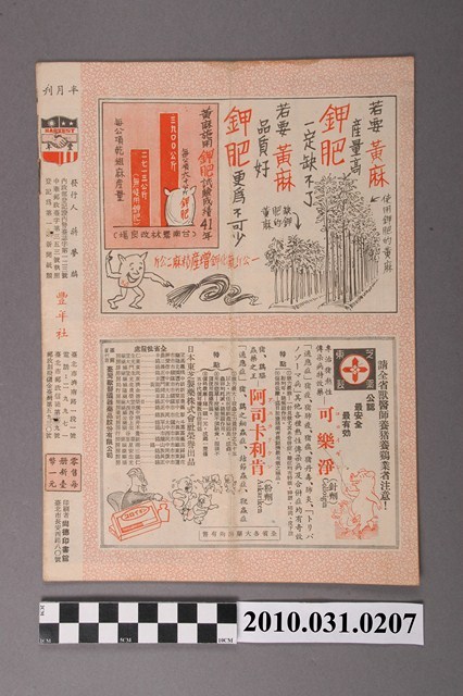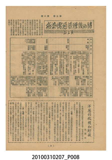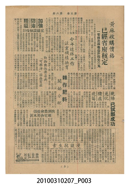 1.本物件為《豐年》雜誌第5卷第6期。封面、封底均用彩色印刷。封面以楊基炘所攝的「雞棚」為底圖。左上部印期刊名,右上部由右而左橫印「第五卷第六期 農民之友 生產之道」,正下緣由右而左橫印「中華民國四十四年三月十六日」。封底左半部載定價及登記、發行、印刷等相關資訊,左上角印有豐年社的商標。內文第5頁下半部為目錄。收錄文章主要為與農畜業相關報導,此外,尚有婦女家庭、兒童天地、小說等專欄。