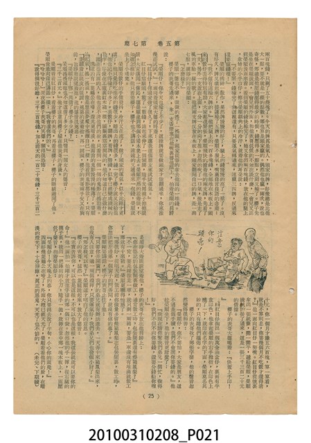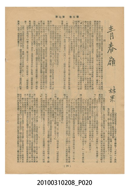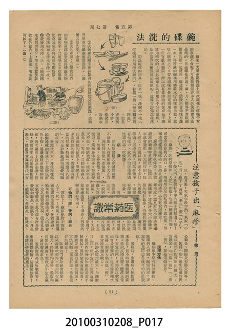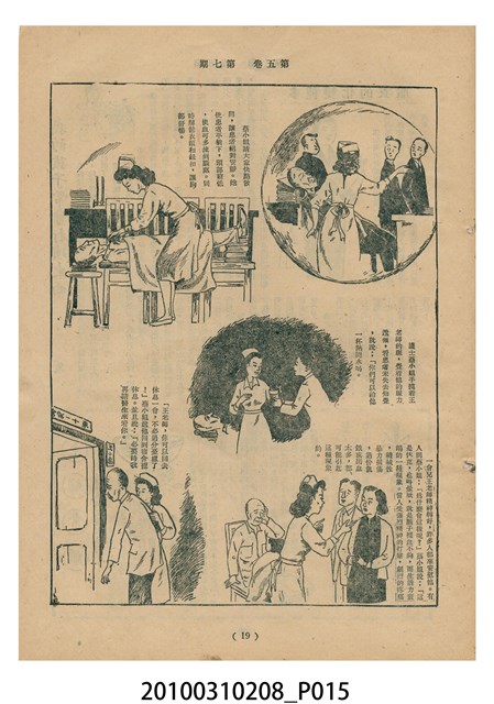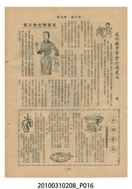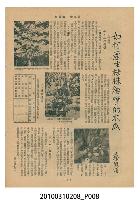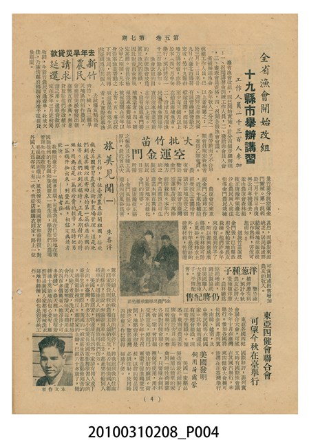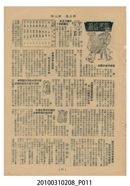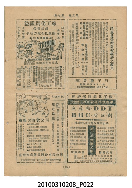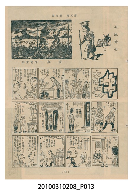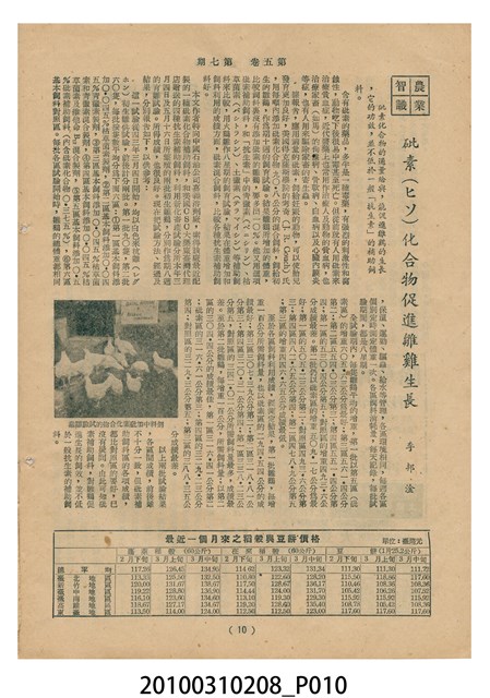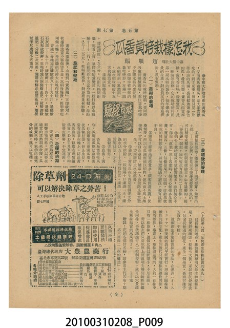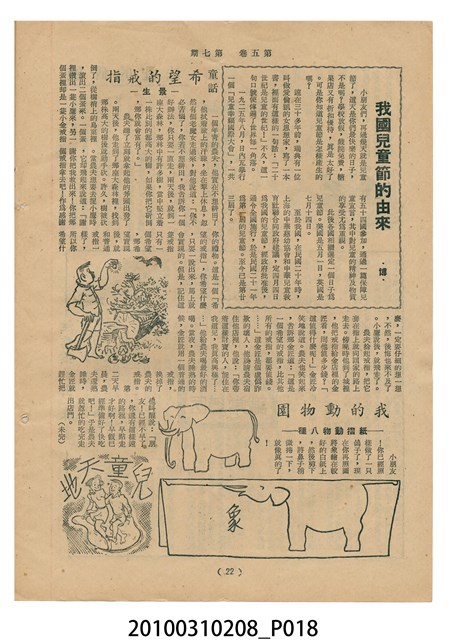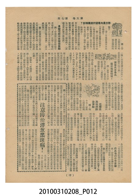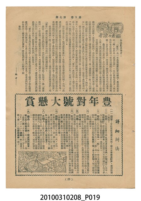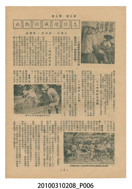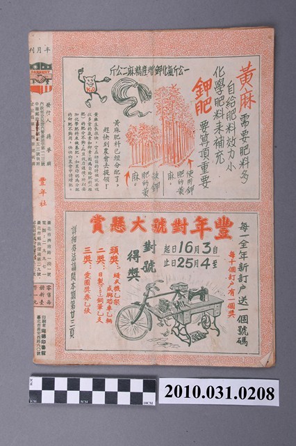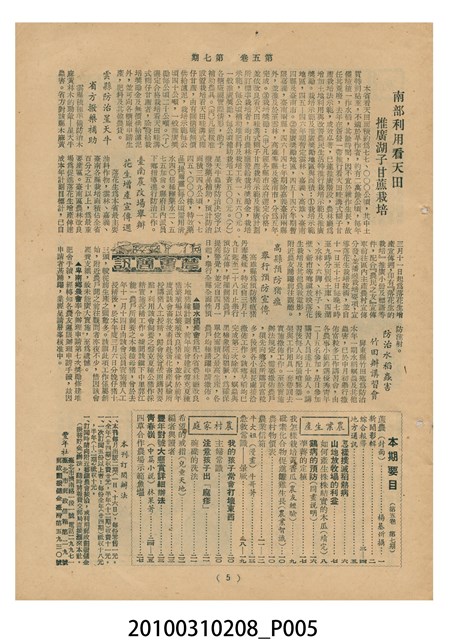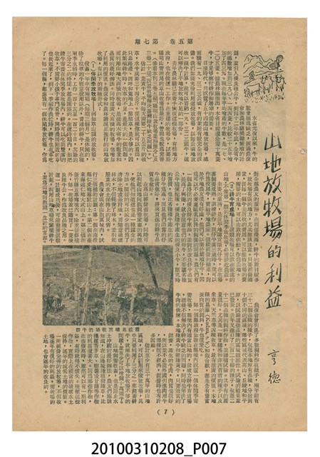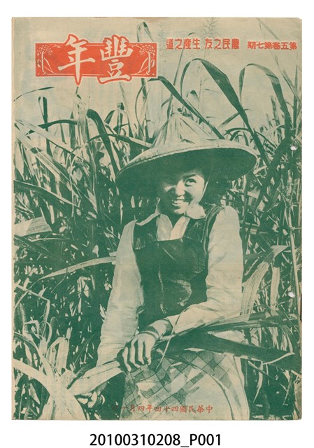 1.本物件為《豐年》雜誌第5卷第7期。封面、封底均用彩色印刷。封面以楊基炘所攝的「蔗農」為底圖。左上部印期刊名,右上部由右而左橫印「第五卷第七期 農民之友 生產之道」,正下緣由右而左橫印「中華民國四十四年四月一日」。封底左半部載定價及登記、發行、印刷等相關資訊,左上角印有豐年社的商標。內文第5頁下半部為目錄。收錄文章主要為與農畜業相關報導,此外,尚有牛哥漫畫、農村家庭、兒童天地、小說等專欄。