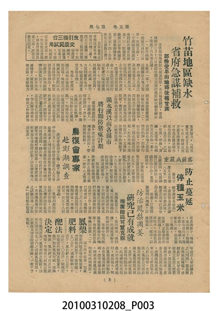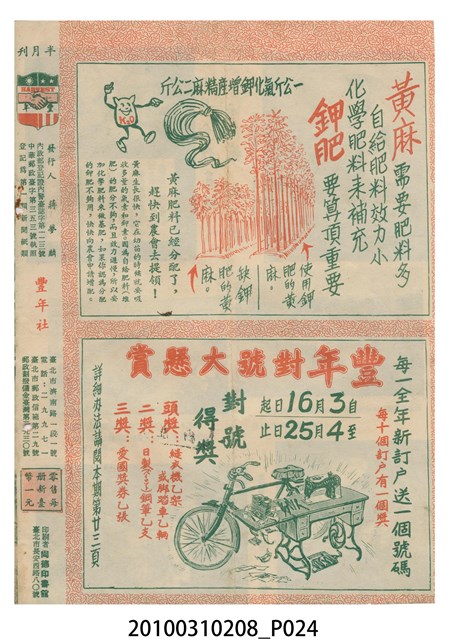 2.《豐年》雜誌是由豐年社所發行的刊物,豐年社成立於民國40年(1951),成立目的在發行銷售有關農業書刊、產品及資材,以服務農民、提高農家所得、改善農家生活。同年7月15日開始發行《豐年》半月刊,初期定位為專業性的農業雜誌,後為因應經濟結構及農村社會的改變,內容也隨之調整,收錄有關生活與生態問題之文章。民國106年(2017)9月,雜誌改為月刊,至今。