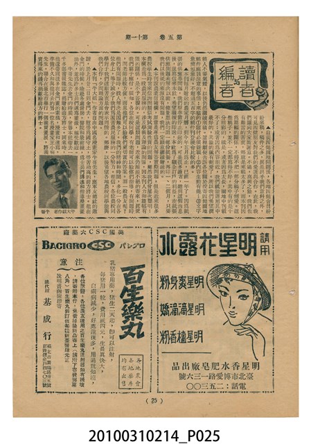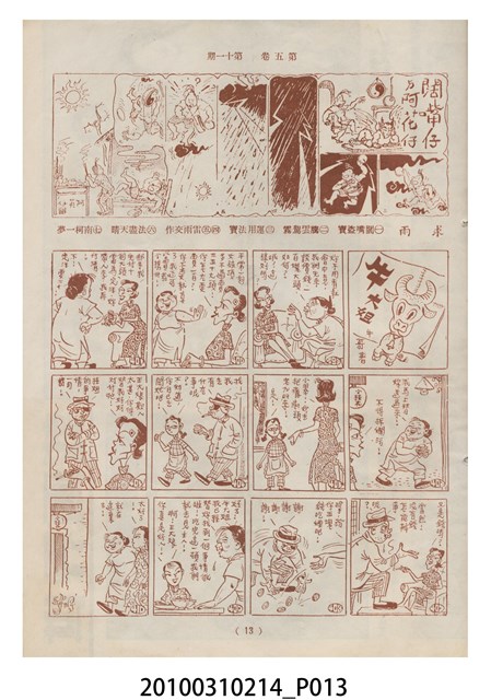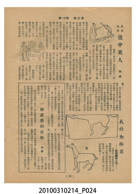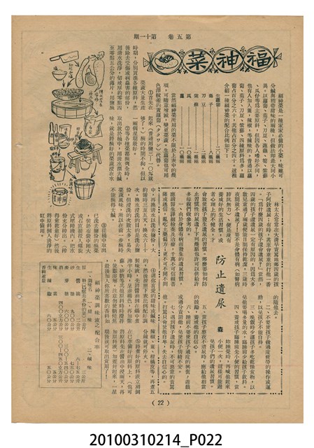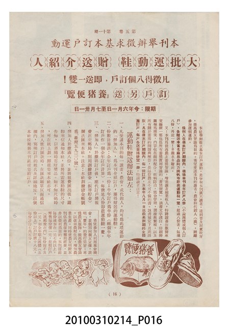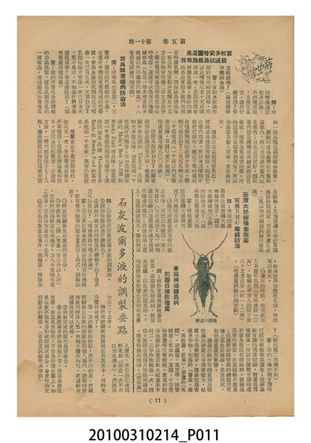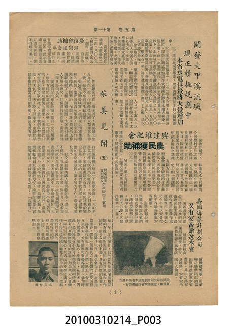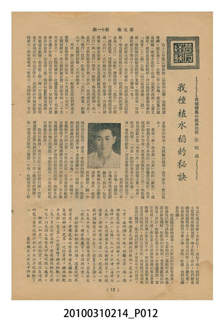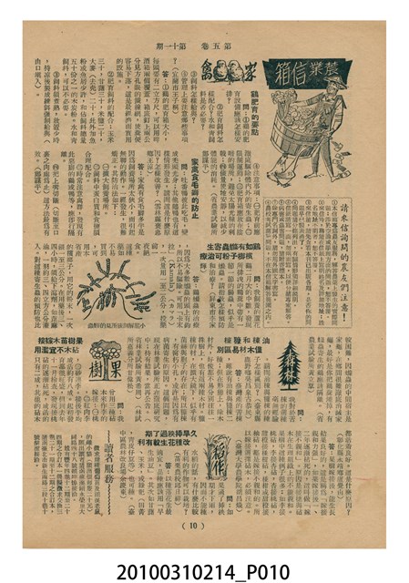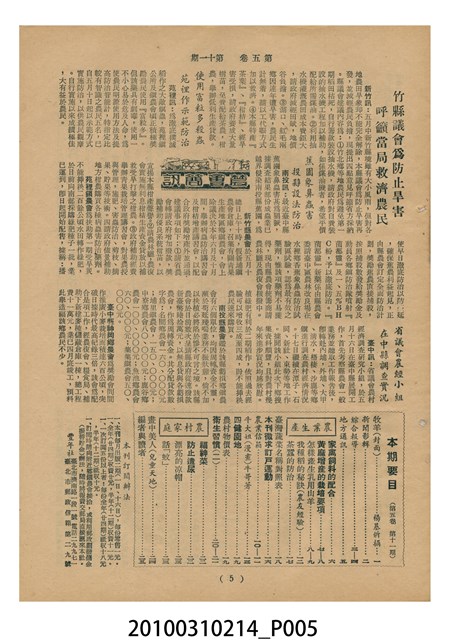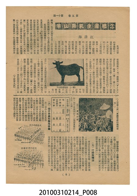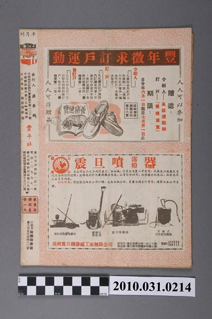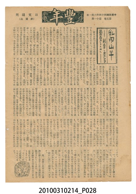 1.本物件為《豐年》雜誌第5卷第11期。封面、封底均用彩色印刷。封面以楊基炘所攝的「牧羊」為底圖。左上部印期刊名,右上部由右而左橫印「第五卷第十一期 農民之友 生產之道」,正下緣由右而左橫印「中華民國四十四年六月一日」。封底左半部載定價及登記、發行、印刷等相關資訊,左上角印有豐年社的商標。內文第5頁下半部為目錄。收錄文章主要為與農畜業相關報導,此外,尚有牛哥漫畫、農村家庭、兒童天地等專欄。