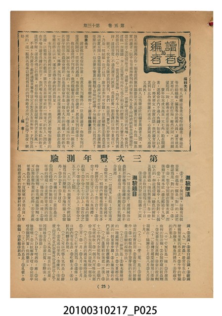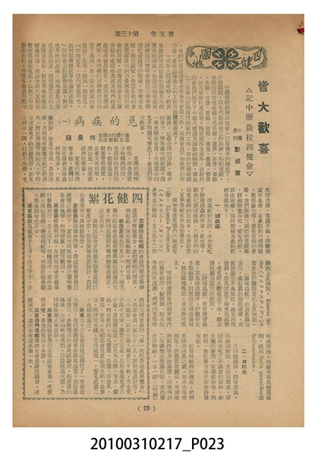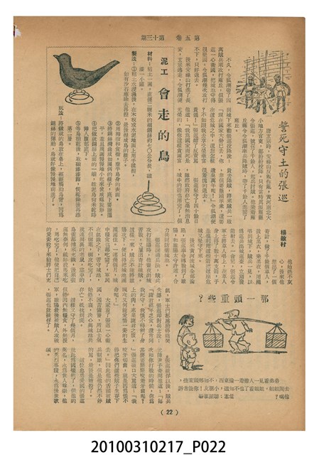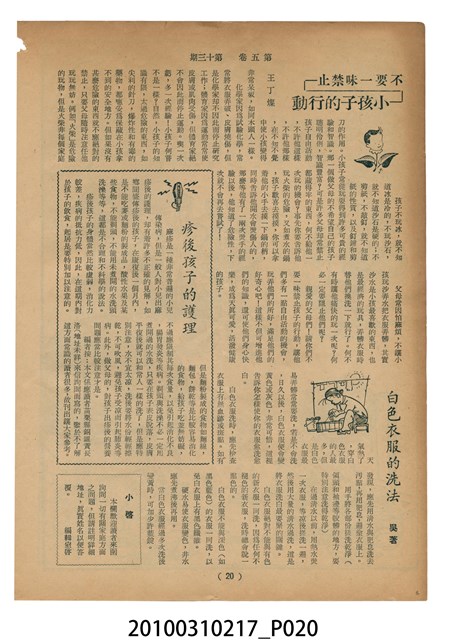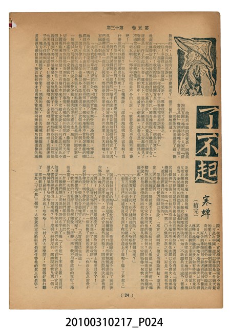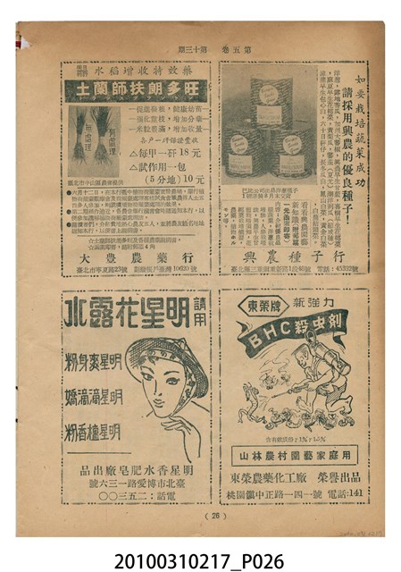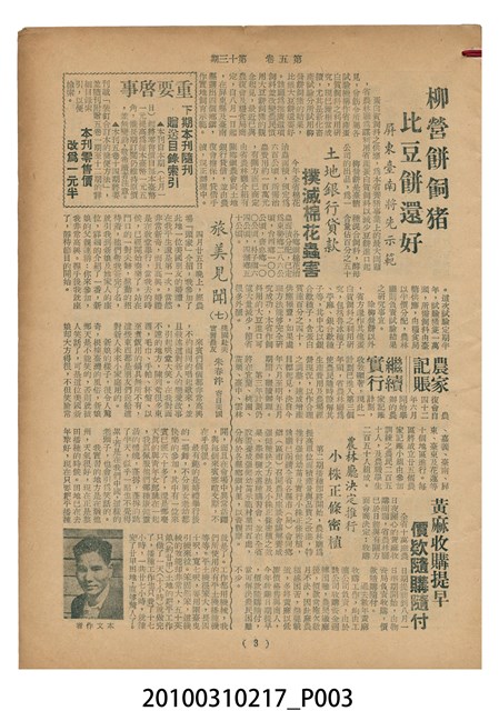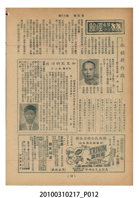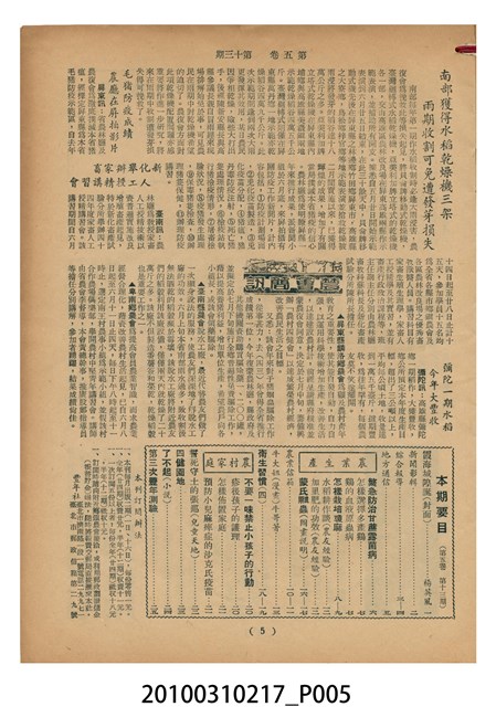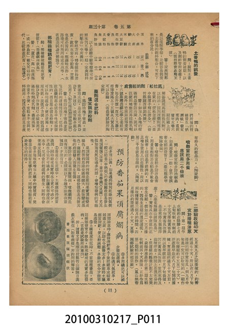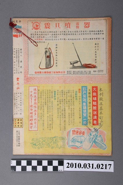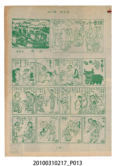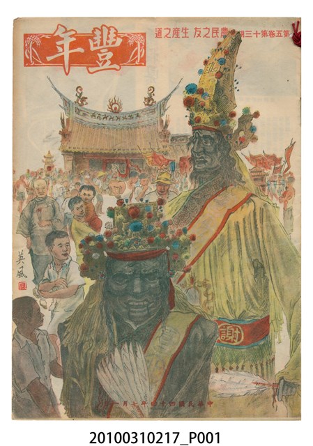 1.本物件為《豐年》雜誌第5卷第13期。封面、封底均用彩色印刷。封面以楊英風所作的「霞海城隍廟」為底圖。左上部印期刊名,右上部由右而左橫印「第五卷第十三期 農民之友 生產之道」,正下緣由右而左橫印「中華民國四十四年七月一日」。封底左半部載定價及登記、發行、印刷等相關資訊,左上角印有豐年社的商標。內文第5頁下半部為目錄。收錄文章主要為與農畜業相關報導,此外,尚有牛哥漫畫、農村家庭、兒童天地、小說等專欄。