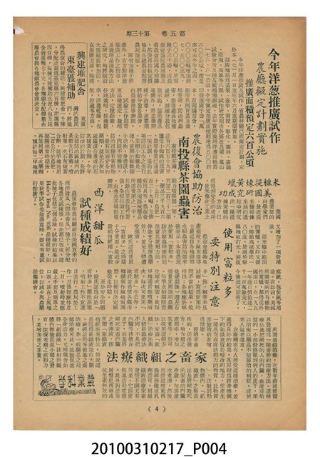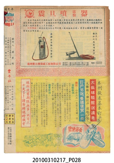 2.《豐年》雜誌是由豐年社所發行的刊物,豐年社成立於民國40年(1951),成立目的在發行銷售有關農業書刊、產品及資材,以服務農民、提高農家所得、改善農家生活。同年7月15日開始發行《豐年》半月刊,初期定位為專業性的農業雜誌,後為因應經濟結構及農村社會的改變,內容也隨之調整,收錄有關生活與生態問題之文章。民國106年(2017)9月,雜誌改為月刊,至今。