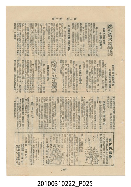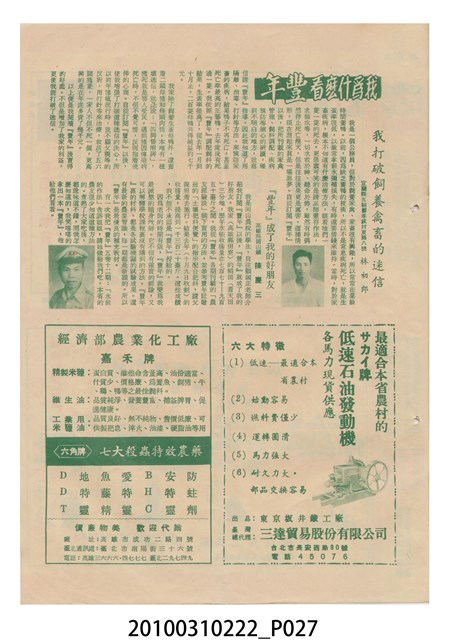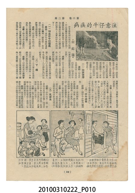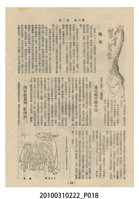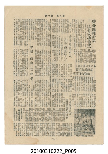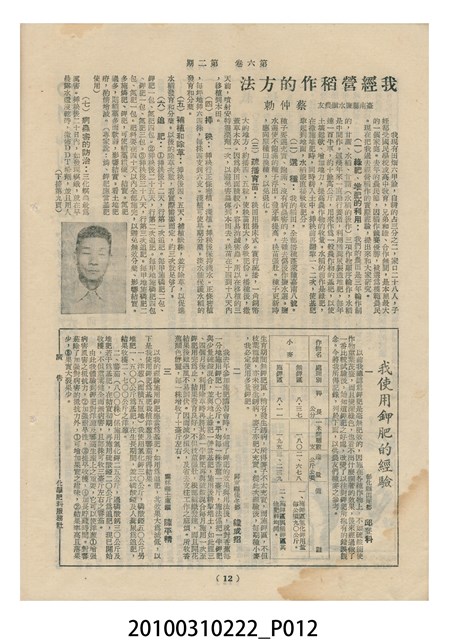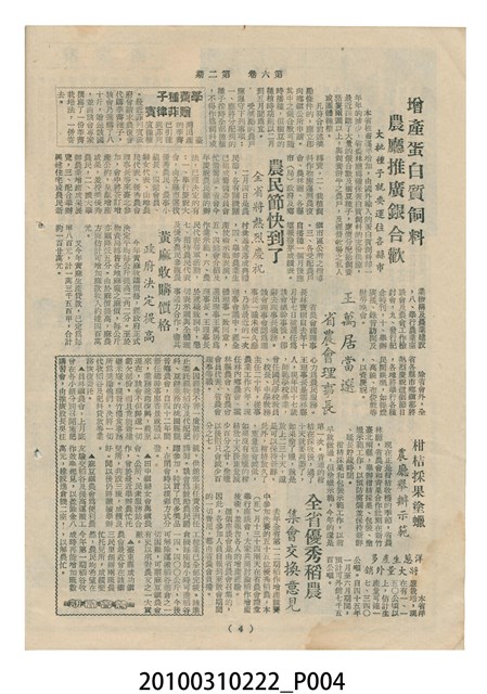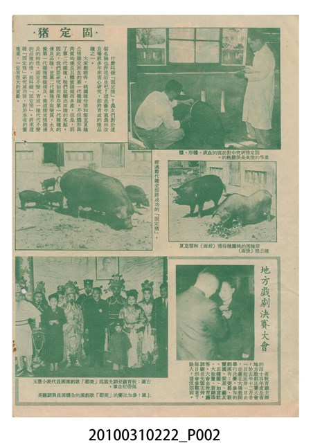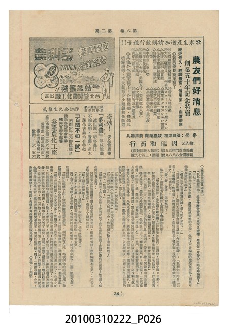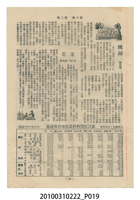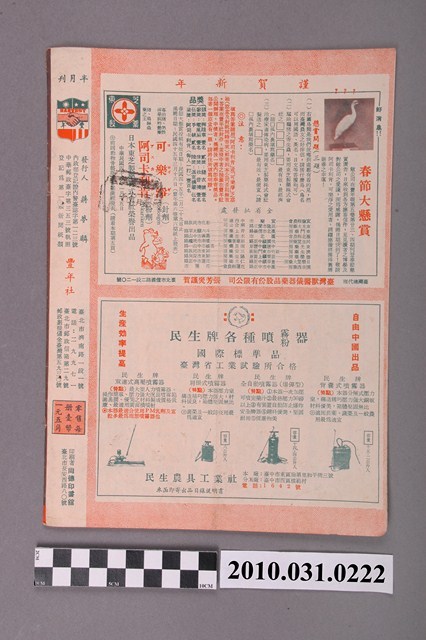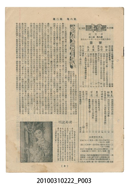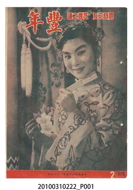 1.本物件為《豐年》雜誌第6卷第2期。封面、封底均用彩色印刷。封面以楊基炘所攝的「洪明秀小姐戲裝」為底圖。左上部印期刊名緊接著由右至左印「農民之友 生產之道」字樣,右下部由右而左橫印「第六卷第2期」,正下緣由右而左橫印「中華民國四十五年一月十六日」。封底左半部載定價及登記、發行、印刷等相關資訊,左上角印有豐年社的商標。內文第3頁右邊為目錄。收錄文章主要為與農畜業相關報導,此外,尚有牛哥漫畫、農村家庭、小說等專欄。